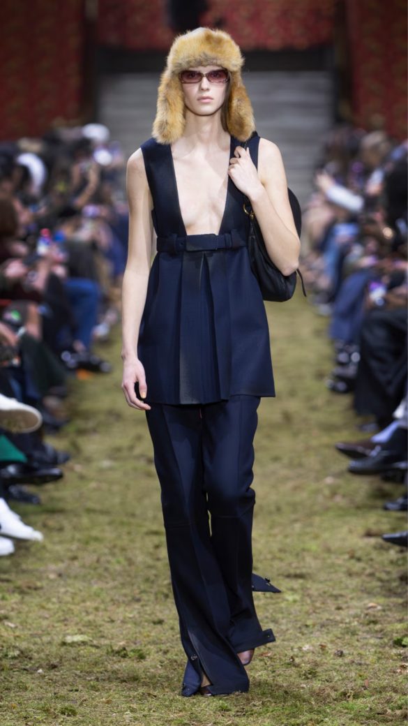 Ο Ghesquière ήταν απόλυτα συγχρονισμένος με τις τάσεις, χρησιμοποιώντας πληθώρα από “τριχωτές” υφές και πειραματιζόμενος με μαύρα κοστούμια, ενώνοντας αυτά τα μοτίβα σε παντελόνια σμόκιν με λωρίδες από χνούδι στις εξωτερικές ραφές αντί για τις κλασικές σατέν ρίγες. Οι τσάντες ήταν εξαιρετικές, ορισμένες μάλιστα παρουσιάστηκαν στην άκρη ενός μπαστουνιού πεζοπορίας. Ήταν πιο λιτές από τα ρούχα, από λείο δέρμα, κάποιες διακοσμημένες με έναν απλό κόμπο, οι άκρες του οποίου προεξείχαν σαν αυτιά κουνελιού.