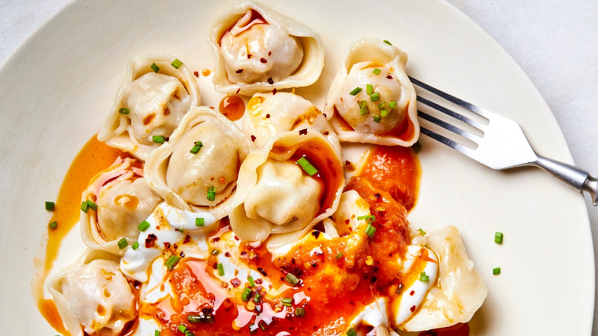 Βράζουμε τα μαντί σε μια κατσαρόλα με αλατισμένο βραστό νερό, για 4’ περίπου. Σερβίρουμε σε πιατέλα, περιχύνοντας με τις σάλτσες γαρίδας και γιαουρτιού. Γαρνίρουμε με ελαιόλαδο, σχοινόπρασο και aleppo pepper.