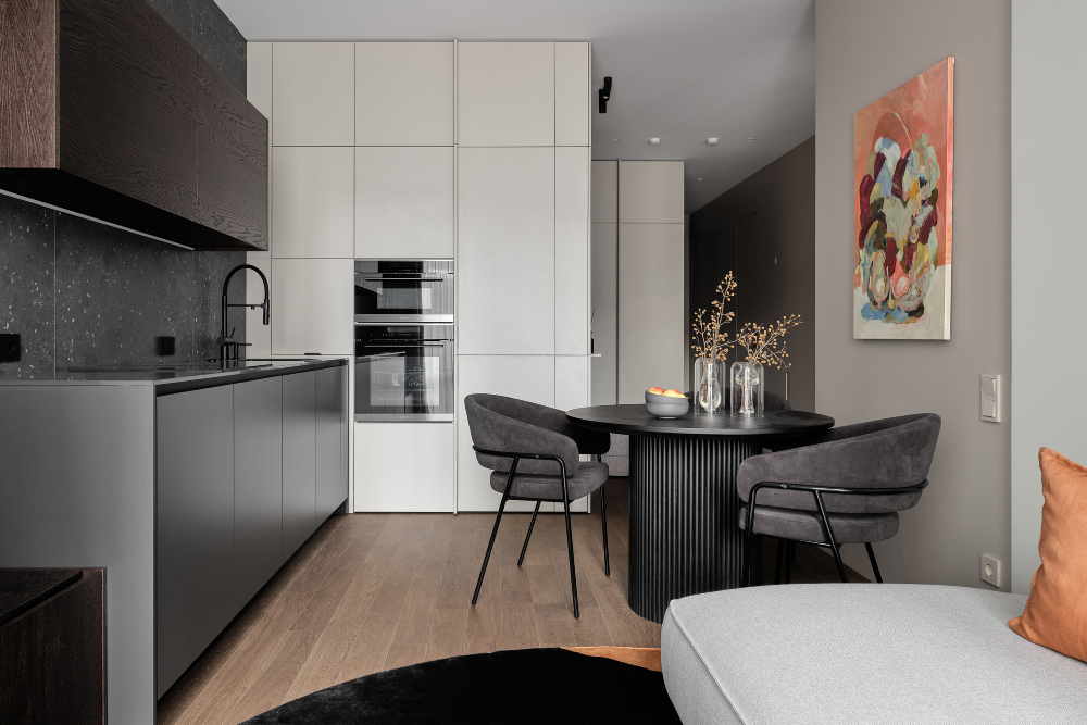 Η χρωματική παλέτα του χώρου κινείται γύρω από τις αποχρώσεις του ανθρακί και του ροδακινί, που σε συνδυασμό με τις πλούσιες ξύλινες υφές, δημιουργούν μια αίσθηση ηρεμίας και ζεστασιάς. Η κουζίνα και το σαλόνι αποτελούνται από απλές γραμμές και φυσικά υλικά, προσφέροντας μια αίσθηση ενότητας. Παράλληλα, τα ντουλάπια της κουζίνας σχεδιάστηκαν με σκοπό να εναρμονίζονται πλήρως με τους τοίχους, χάρη στην απόχρωση και τη λειτουργική απλότητα χωρίς χειρολαβές, δημιουργώντας ένα διακριτικό και ήρεμο περιβάλλον.