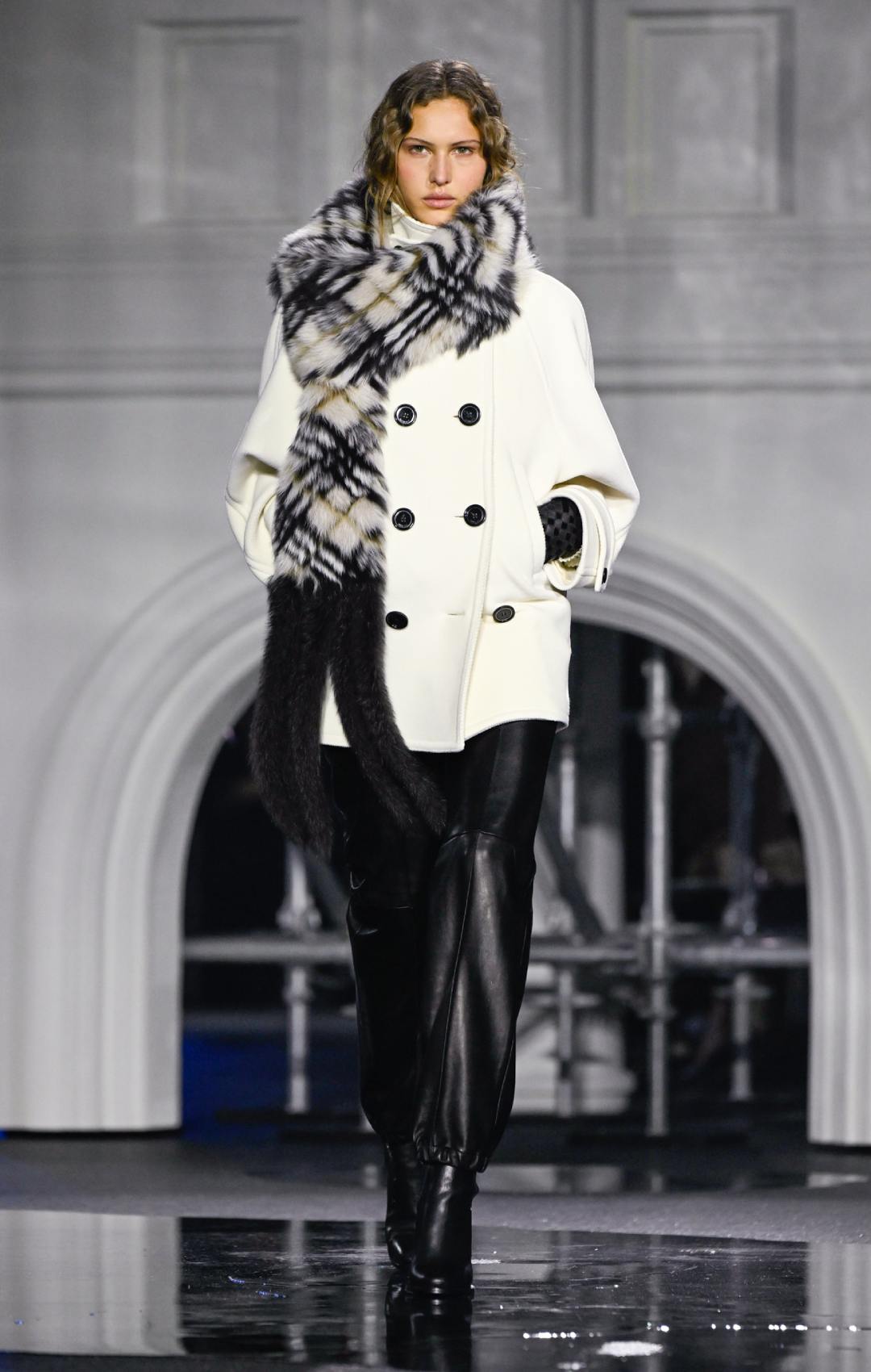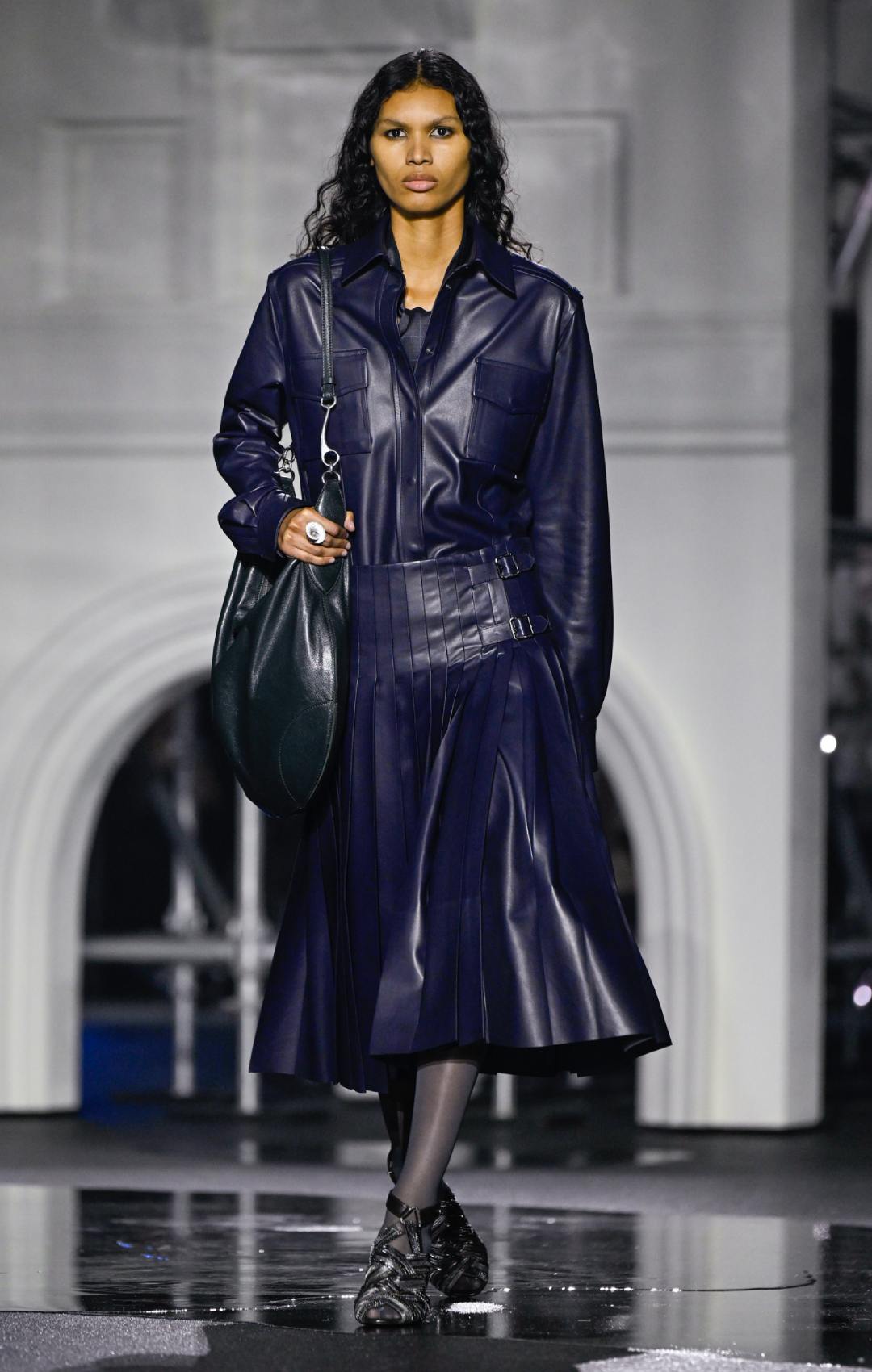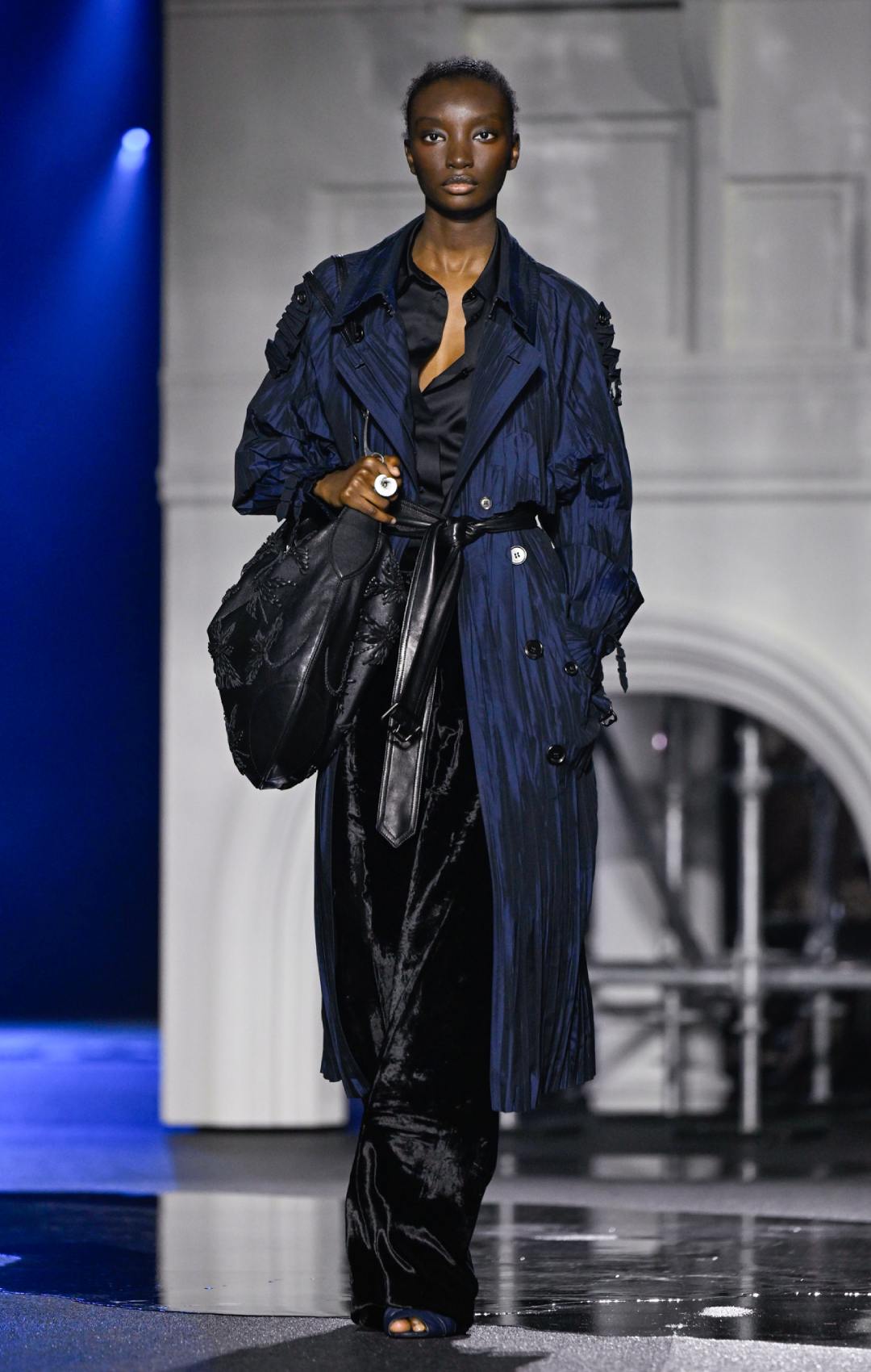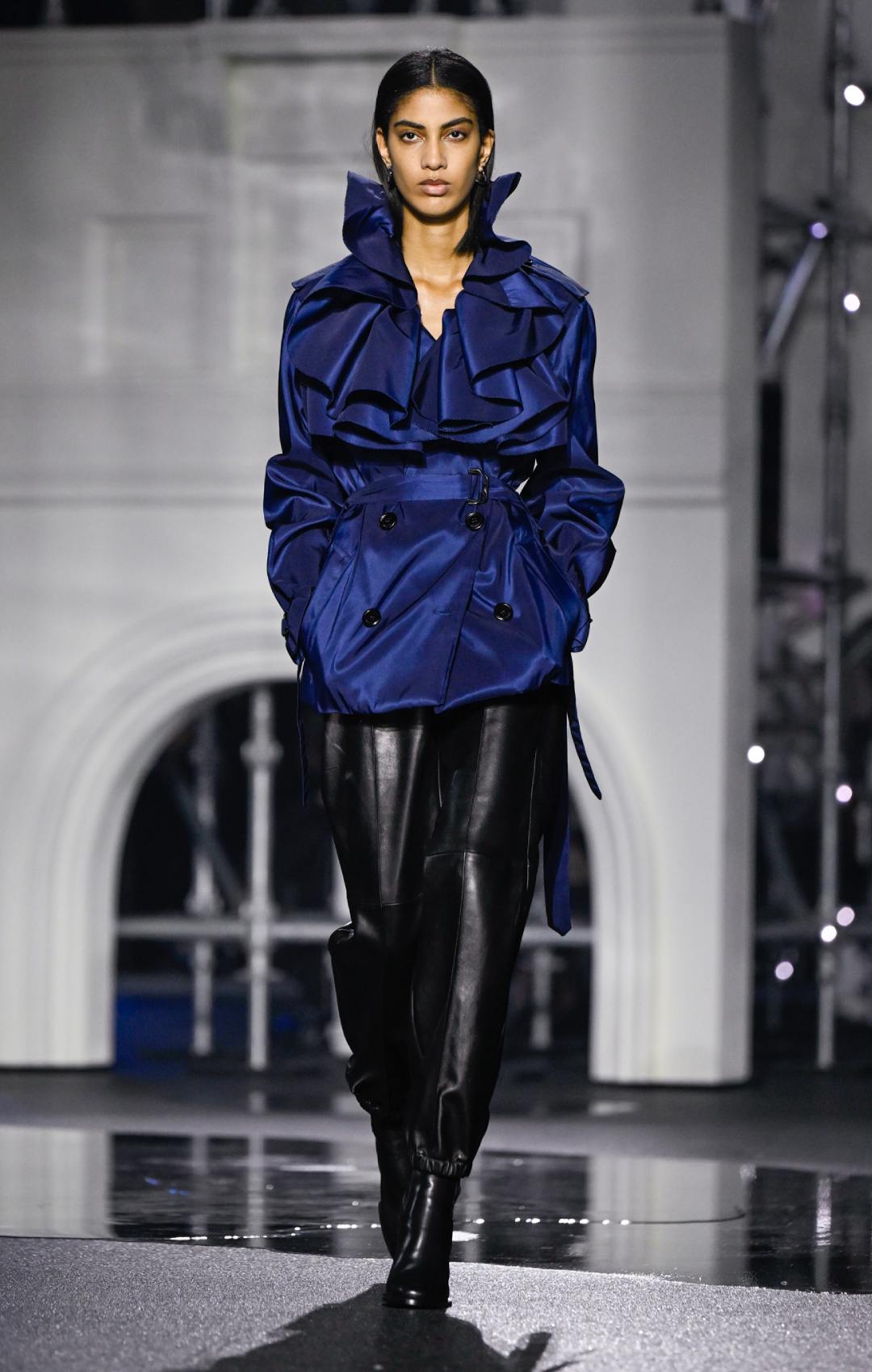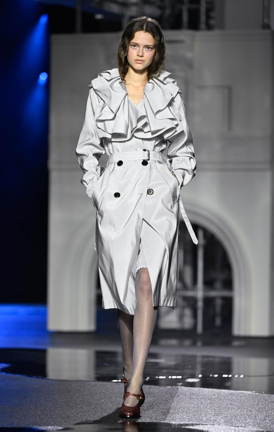 Το σκηνικό στο Old Billingsgate ενίσχυσε θεατρικά αυτή τη διάθεση, με μια εντυπωσιακή αναπαράσταση του Tower Bridge να δεσπόζει στον χώρο. Τα λαμπερά φώτα της γέφυρας και οι «μαύρες» λακκούβες πάνω στην πασαρέλα δημιουργούσαν την ψευδαίσθηση ενός βρεγμένου λονδρέζικου δρόμου, θολώνοντας τα όρια ανάμεσα στη μόδα και το αστικό τοπίο. Η συλλογή έμοιαζε απόλυτα εναρμονισμένη με την πραγματικότητα της εποχή.