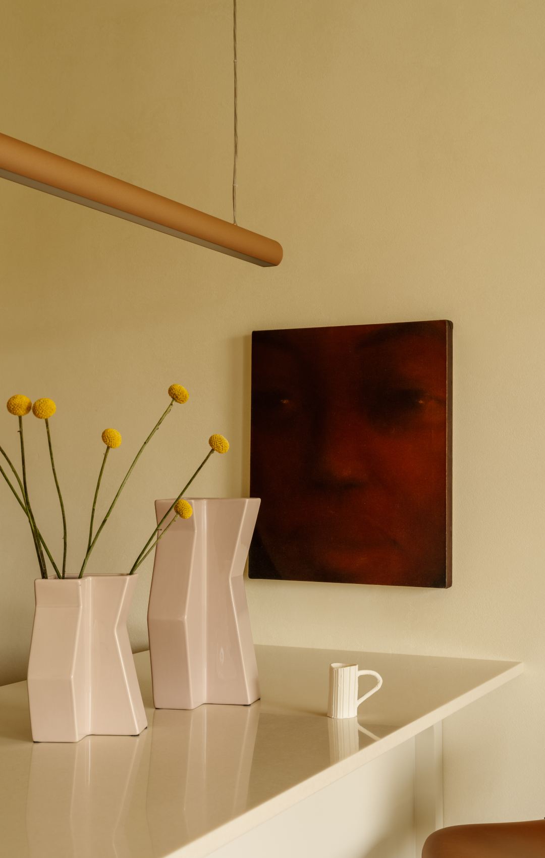 Ιδιαίτερη σημασία δόθηκε στην τέχνη και στα διακοσμητικά στοιχεία. Η αφίσα παλιάς ευρωπαϊκής ταινίας στο υπνοδωμάτιο, τα αφαιρετικά έργα στους τοίχους και τα κεραμικά αντικείμενα δημιουργούν μια αφήγηση. Δεν πρόκειται για διακόσμηση βιτρίνας, αλλά για στοιχεία που υποδηλώνουν προσωπικές επιλογές, μνήμες και ταξίδια. Το σπίτι δείχνει σαν να κατοικείται εδώ και χρόνια, όχι σαν να παραδόθηκε μόλις.