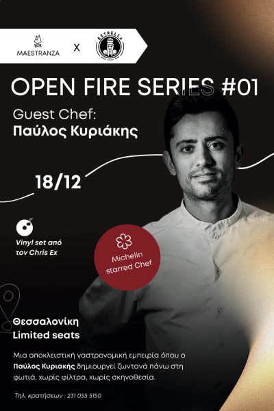 Ο βραβευμένος με Michelin Star chef Παύλος Κυριάκης θα εγκαινιάσει το Open Fire Series ως ο πρώτος guest chef του Maestranza, στο κέντρο της Θεσσαλονίκης.
