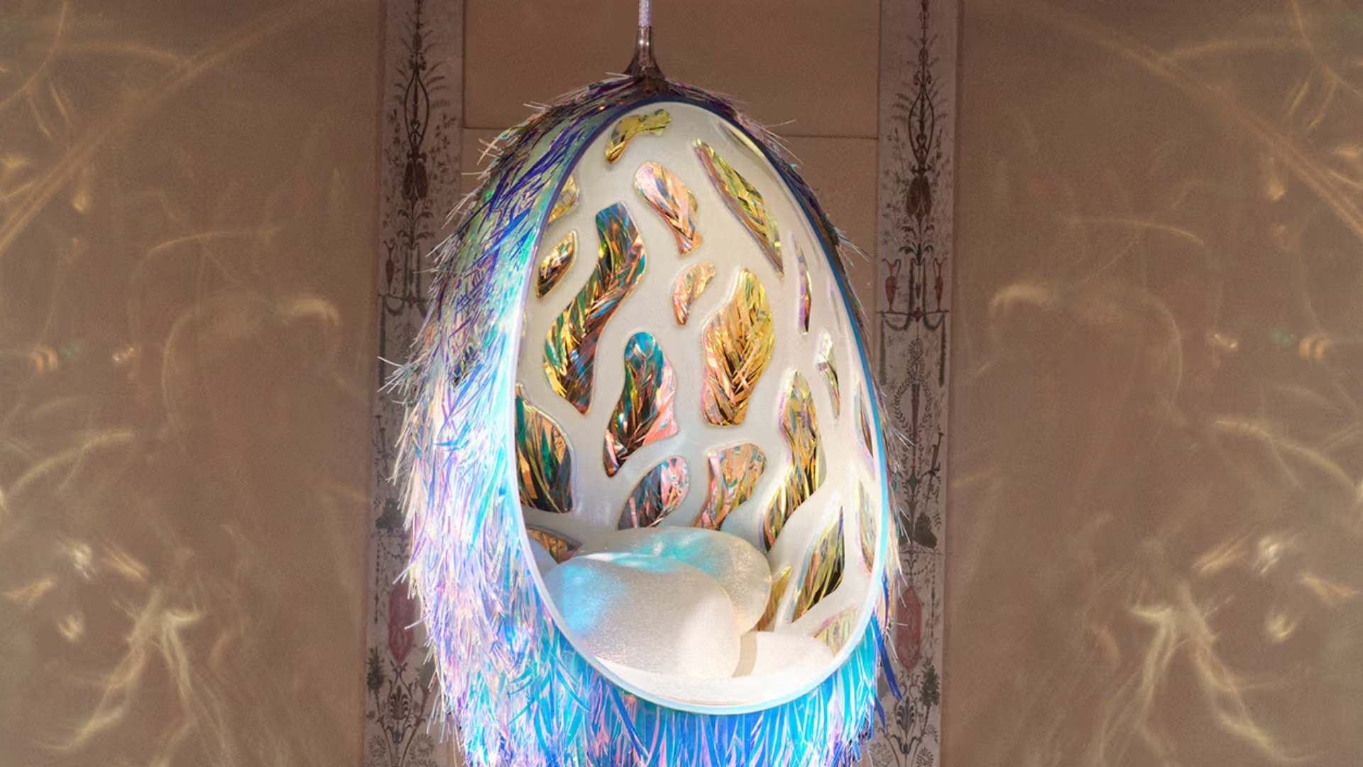 Το Boudoir αναδεικνύει το περίτεχνο Cabinet Kaléidoscope, με τη δερμάτινη μαρκετερί και τα πόδια σε σχήμα γοργόνας, καθώς και την αστραφτερή καρέκλα Cocoon Dichroic, αμφότερα δημιουργίες του Estudio Campana με τη συμβολή της Géraldine Gonzalez.