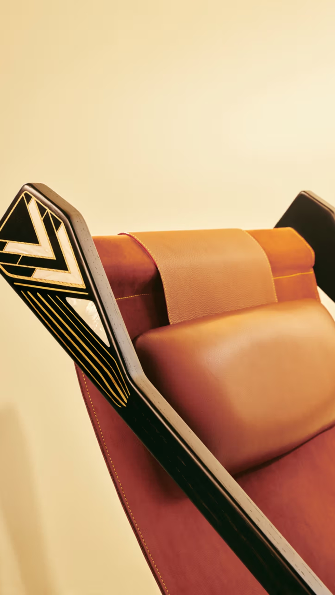Η καρέκλα Riviera Chilienne: Ανασταίνεται από τα αρχεία του Legrain, διαθέτοντας ξύλο, δέρμα και μαρκετερί από φίλντισι.