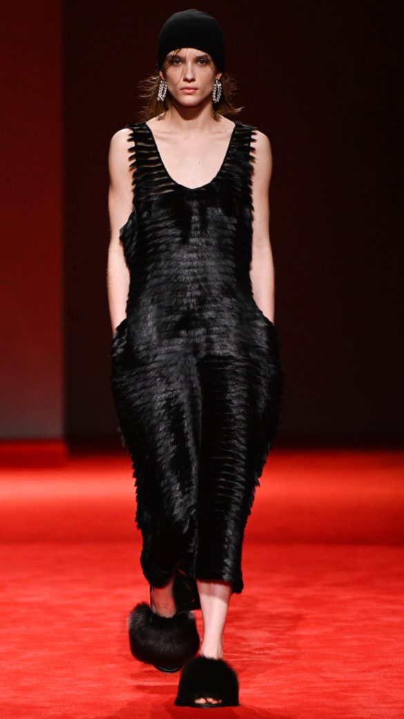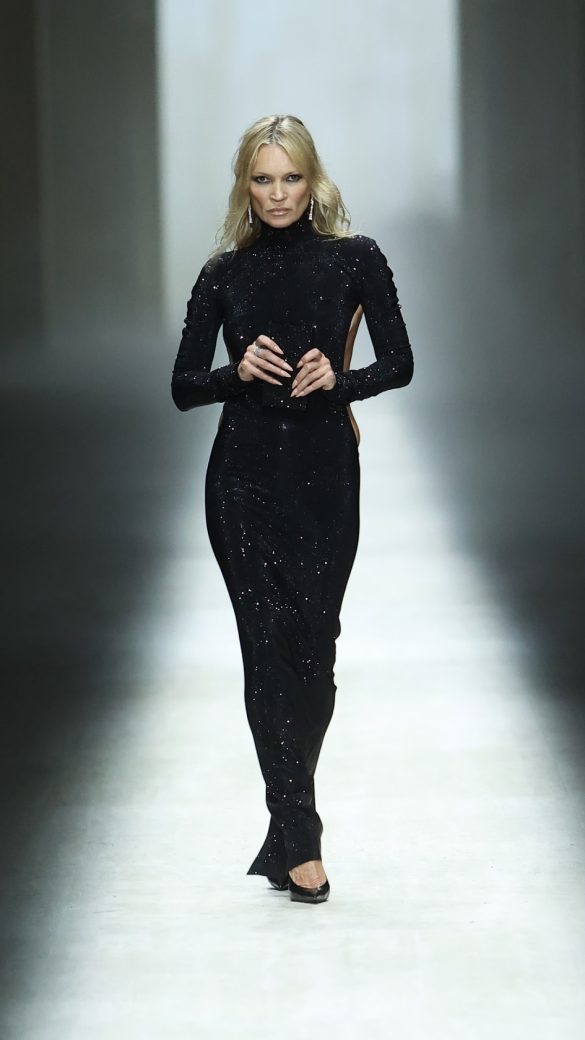 Ωστόσο, ο Demna είχε πολλά περισσότερα να δείξει όσον αφορά τους σωματότυπους, το ύψος και τις ηλικίες – σημειώστε τις επιστροφές της Karlie Kloss και της Kate Moss που έκλεισε το σόου. Ένα αστραφτερό λευκόχρυσο GG string, στολισμένο με διαμάντια 10 καρατίων, ξεπρόβαλλε μέσα από την εντυπωσιακή εξώπλατη μαύρη τουαλέτα της Moss, θυμίζοντας την «va-va-voom» εποχή του Tom Ford. Αν και ο Demna άφησε το δικό του στίγμα, υπήρχαν σαφείς αναφορές στον Ford – ακόμα πιο σέξι στα χέρια του – αλλά και στον Michele, με τις γούνινες παντόφλες Princetown να αποτελούν ένα χαρακτηριστικό παράδειγμα.