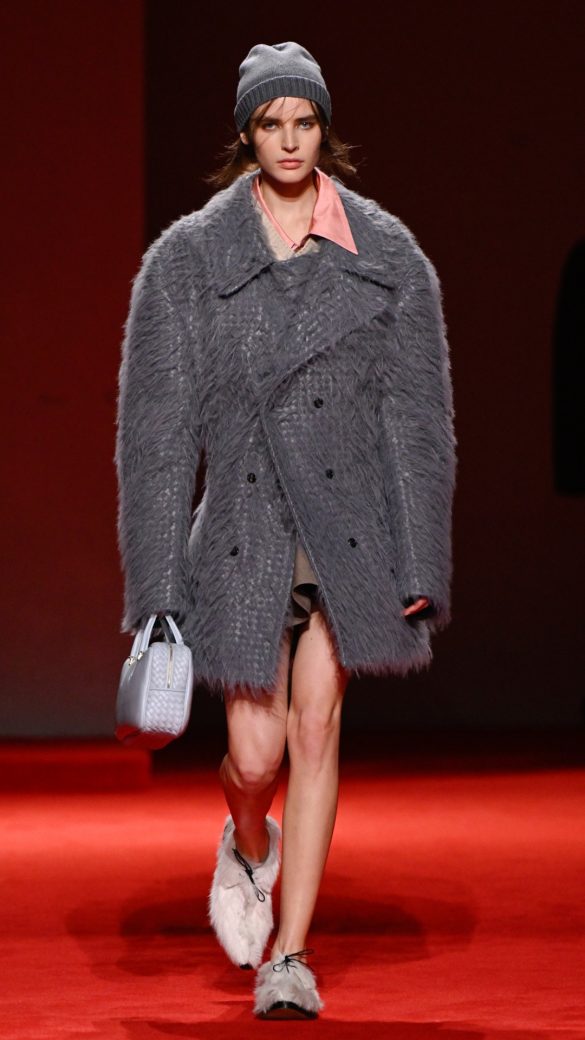 Η Louise Trotter αφιέρωσε την πρώτη της συλλογή για τη Bottega Veneta στο χαρακτηριστικό δερμάτινο πλέγμα Intrecciato. Ουσιαστικά, η δεύτερη προσπάθεια της Βρετανίδας σχεδιάστριας επικεντρώθηκε εξ ολοκλήρου στις «τριχωτές» υφές.