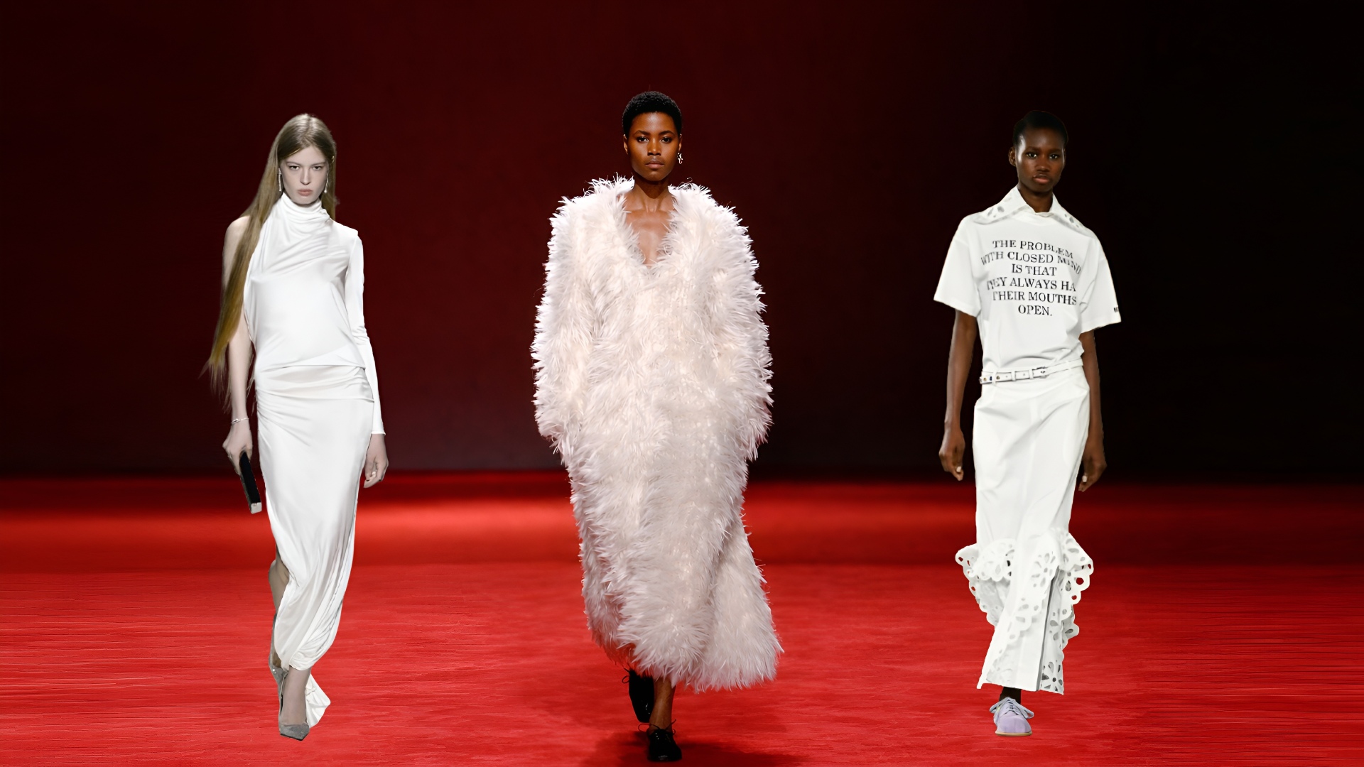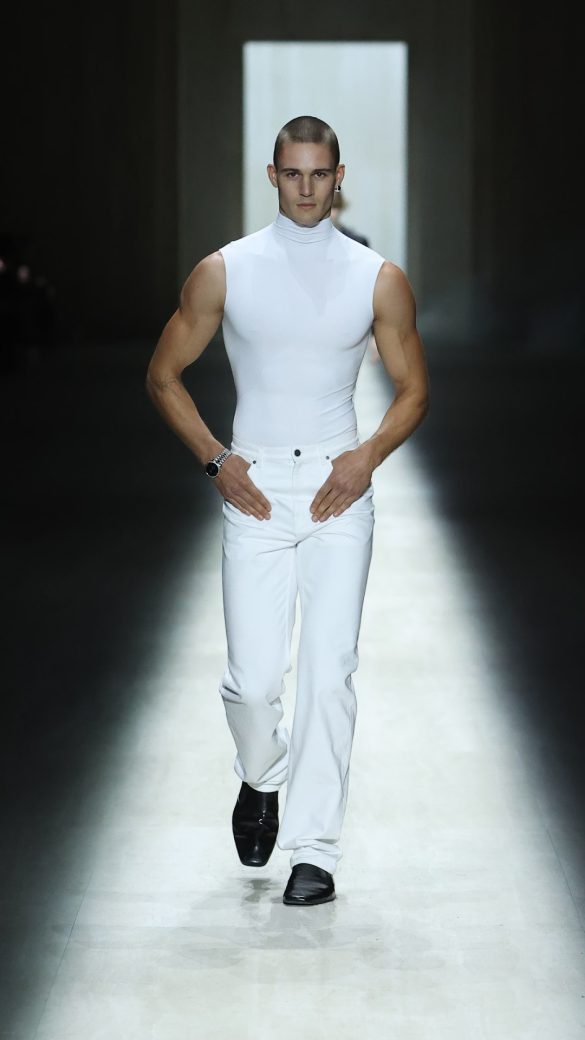 Το πρώτο look – ένα μίνι φόρεμα χωρίς ραφές από λευκό ύφασμα καλσόν που αγκάλιαζε το σώμα – λειτούργησε ως «καθαριστικό» για την παλέτα των θεατών. Το επόμενο look έκανε στροφή 180 μοιρών, με ένα εξαιρετικά γυμνασμένο ανδρικό μοντέλο, του οποίου οι μύες διαγράφονταν κάτω από ένα λευκό αμάνικο T-shirt και παντελόνι. Όπως έγραψε ο Demna στις σημειώσεις του, ο οίκος Gucci κατάφερε να αναπτύξει ρούχα χωρίς ραφές, «κομμένα όσο το δυνατόν πιο κοντά στο σώμα, με αόρατα θερμοκολλημένα τελειώματα και καμπυλωτά στριφώματα».