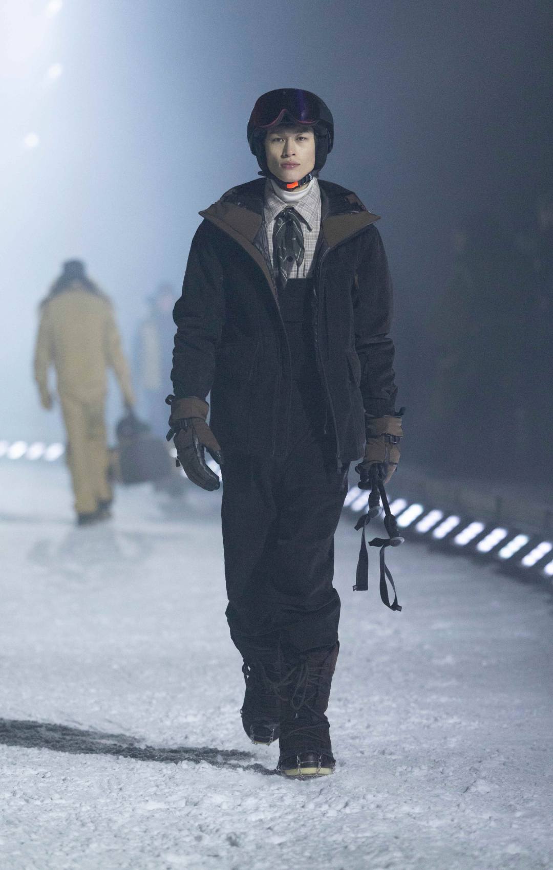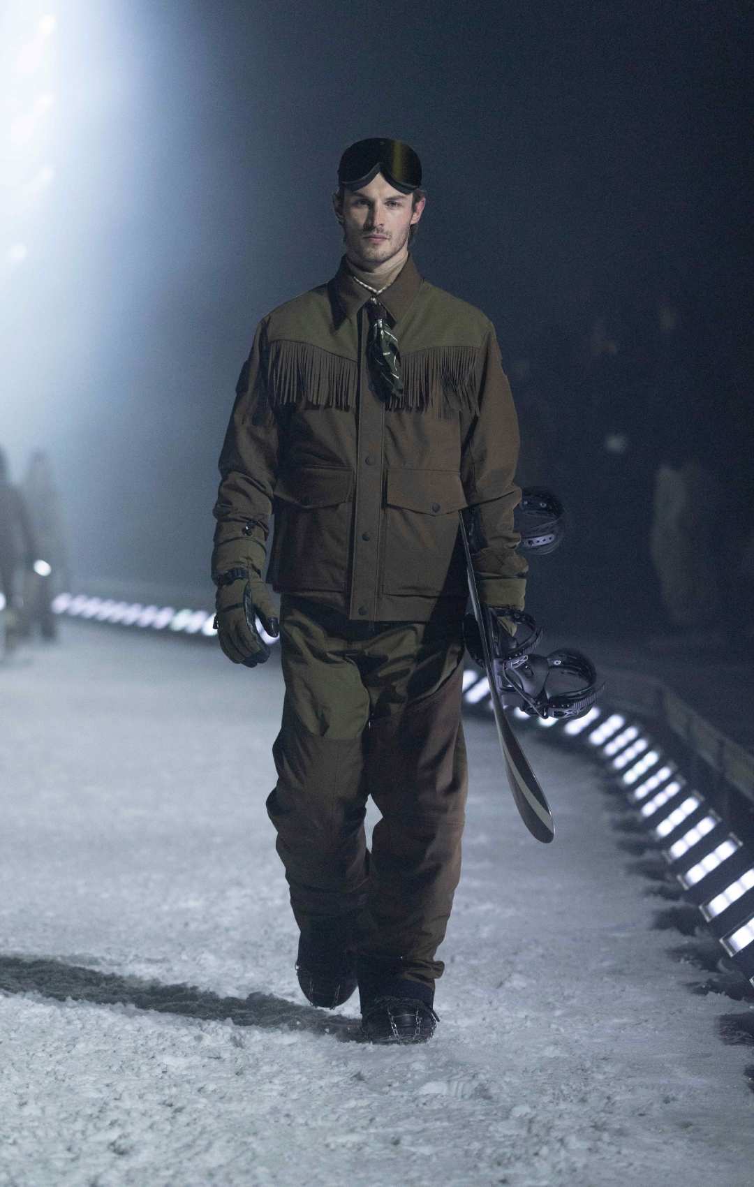 Στη χιονισμένη πλαγιά τα μοντέλα κατέβαιναν ανάμεσα σε moguls, παρουσιάζοντας ρούχα που συνδύαζαν λειτουργικότητα και couture αισθητική. Από τα πρώτα λευκά outfits που σχεδόν συγχωνεύονταν με το τοπίο, μέχρι τα κύρια κομμάτια της συλλογής, η αίσθηση του χειμερινού τοπίου και του Άσπεν ήταν παρούσα σε κάθε λεπτομέρεια.