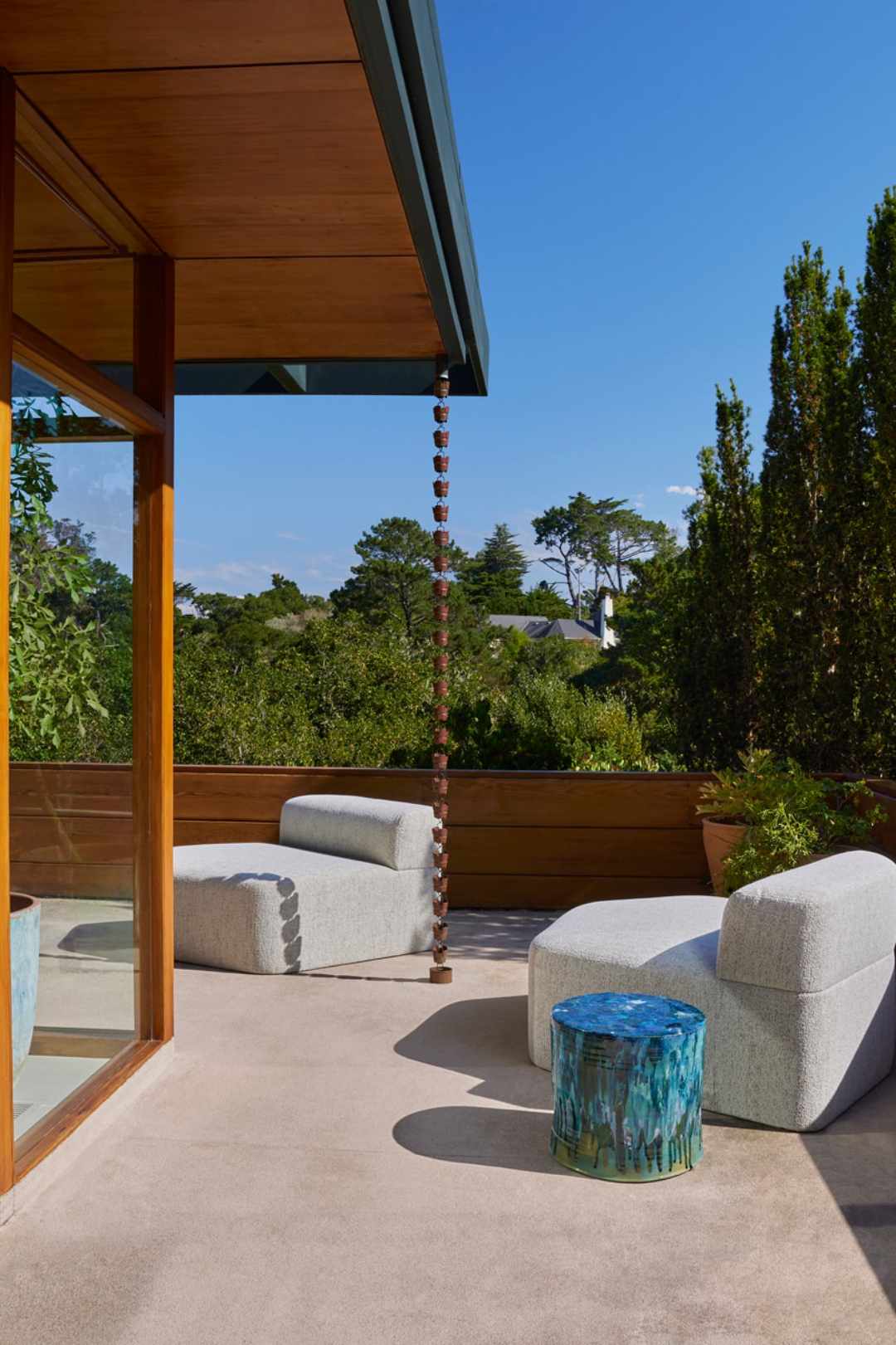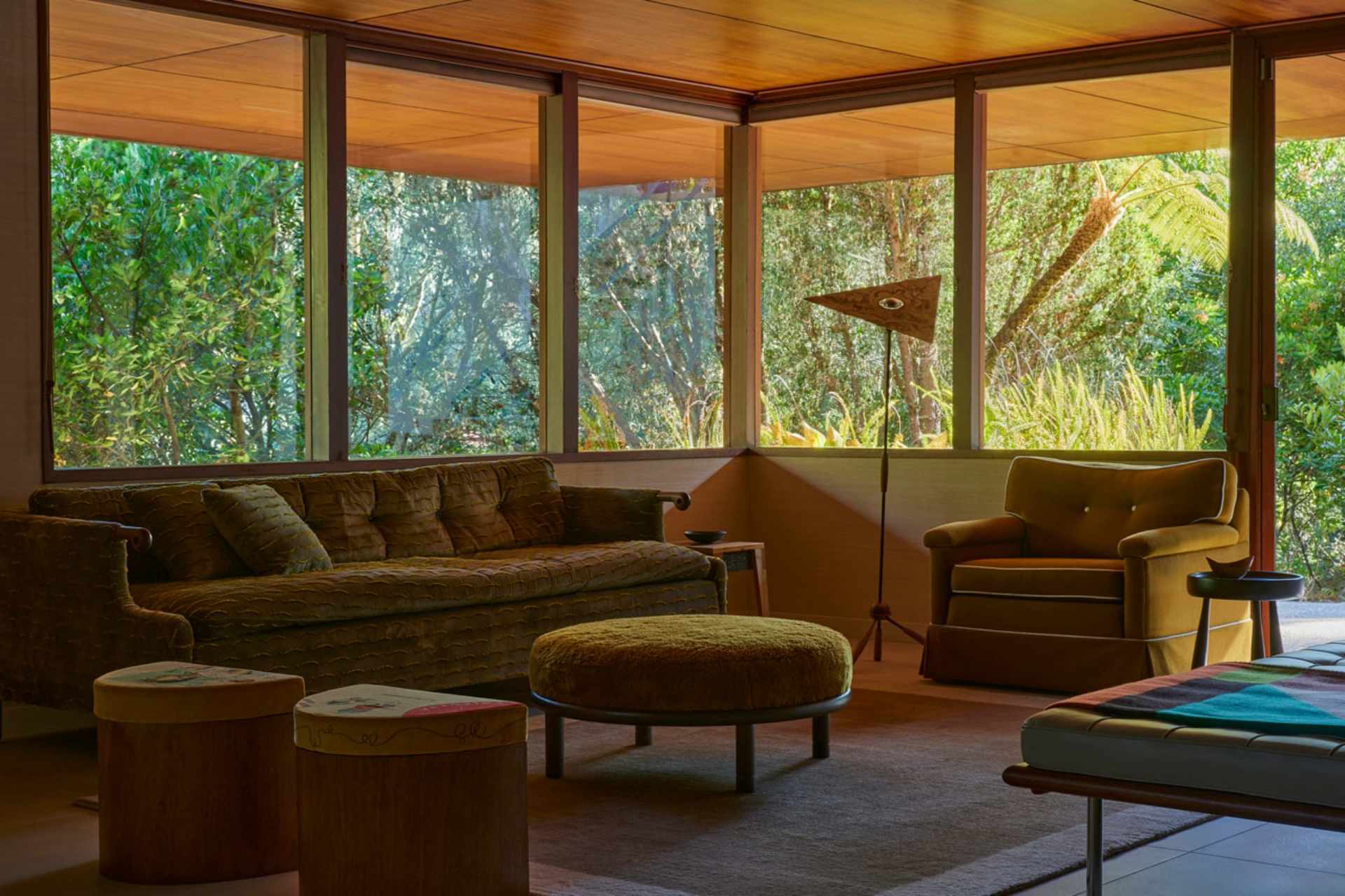 Την αίσθηση ελαφρότητας ενισχύουν γυάλινες επιφάνειες, όπως το τραπέζι τραπεζαρίας και το τραπεζάκι σαλονιού, που αντανακλούν το φως και περιορίζουν τις σκιές. Η επίπλωση του Monterey home συνδυάζει εμβληματικά σχέδια του μεσοπολέμου – όπως καρέκλες του Pierre Cardin, πολυθρόνες των Otto Schultz και Gerrit Rietveld – με σύγχρονες, γλυπτικές δημιουργίες, όπως ο αρθρωτός καναπές Big Sur του Hilal. Το αποτέλεσμα είναι ένας χώρος με οργανική και εκλεκτική ταυτότητα, όπου η ιστορία του σπιτιού συνυπάρχει αρμονικά με τις σημερινές τάσεις προς πιο ήπιες και φυσικές γραμμές, αποδίδοντας φόρο τιμής στο παρελθόν του.