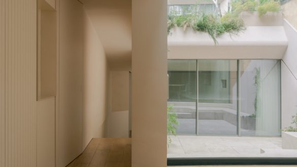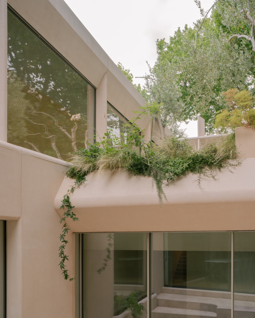 Η κάτω και η πάνω αυλή συνδέονται μέσω μιας εκλεπτυσμένης κιονοστοιχίας που πλαισιώνει τις εναλλασσόμενες θέες προς τη φύτευση και τον ουρανό.