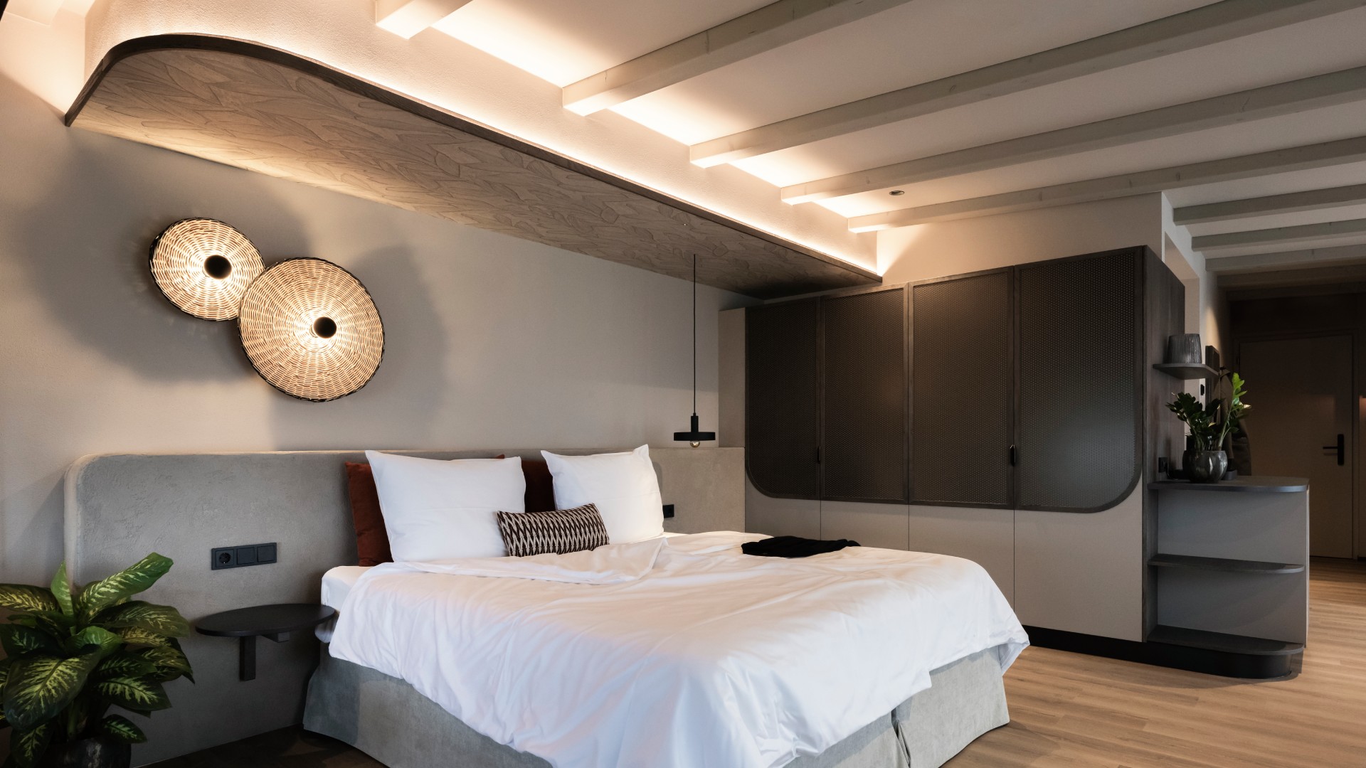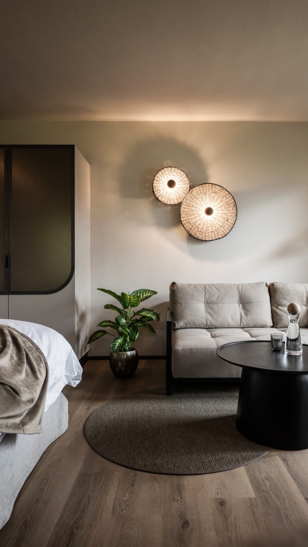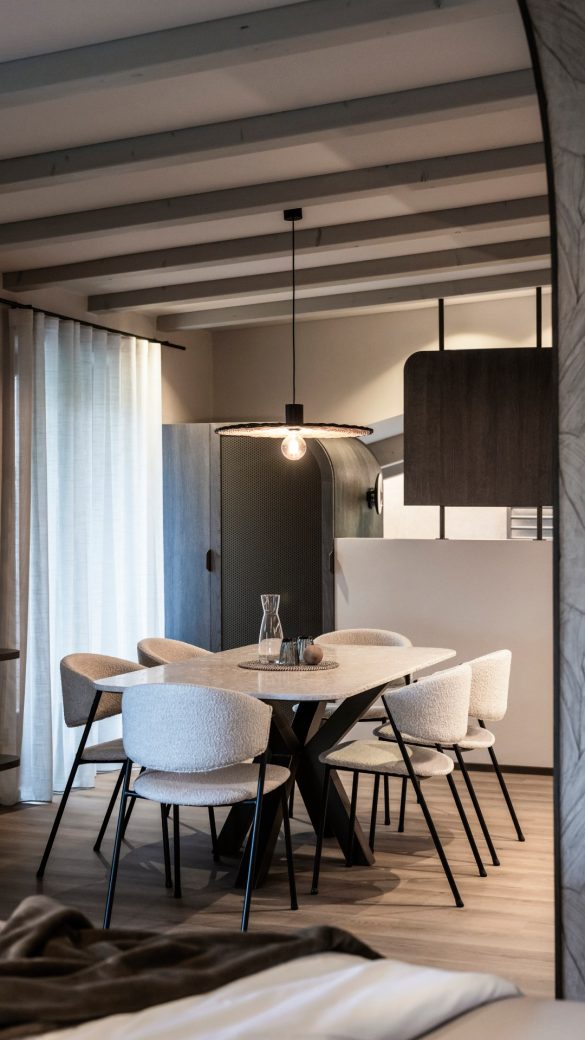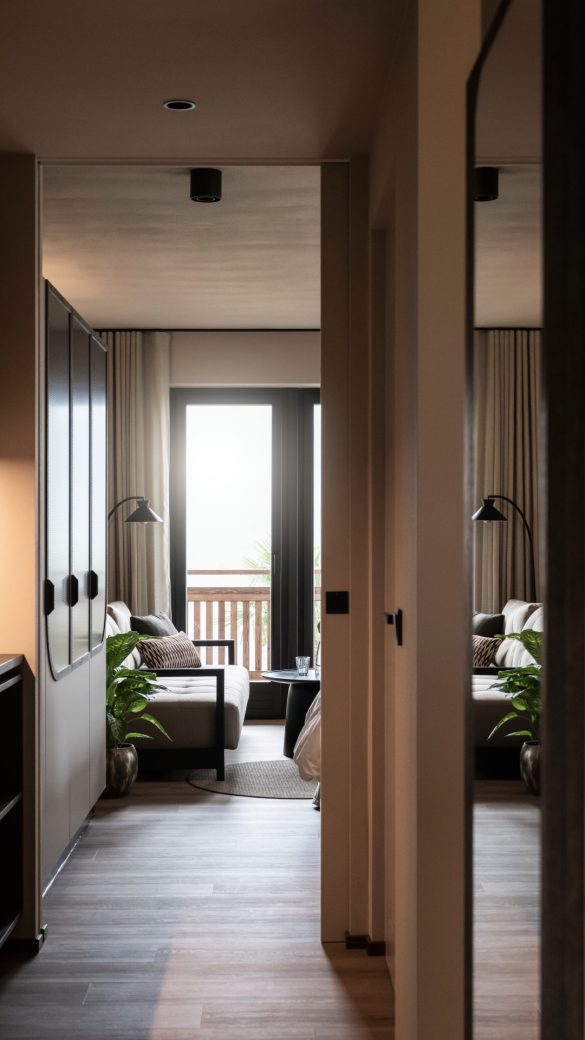 Στα δωμάτια, τα πάντα έχουν σχεδιαστεί για να εξασφαλίσουν συνέχεια και μια πλήρως καθηλωτική αισθητηριακή εμπειρία. Τα υλικά περιλαμβάνουν μέταλλο, ξύλο, ρατάν, κεραμικό και σοβά. Η χρωματική παλέτα είναι συγκρατημένη και διακριτική, με μοναδική εξαίρεση μια κοραλλί πινελιά στους τοίχους της κουζίνας και στα υφασμάτινα στοιχεία.