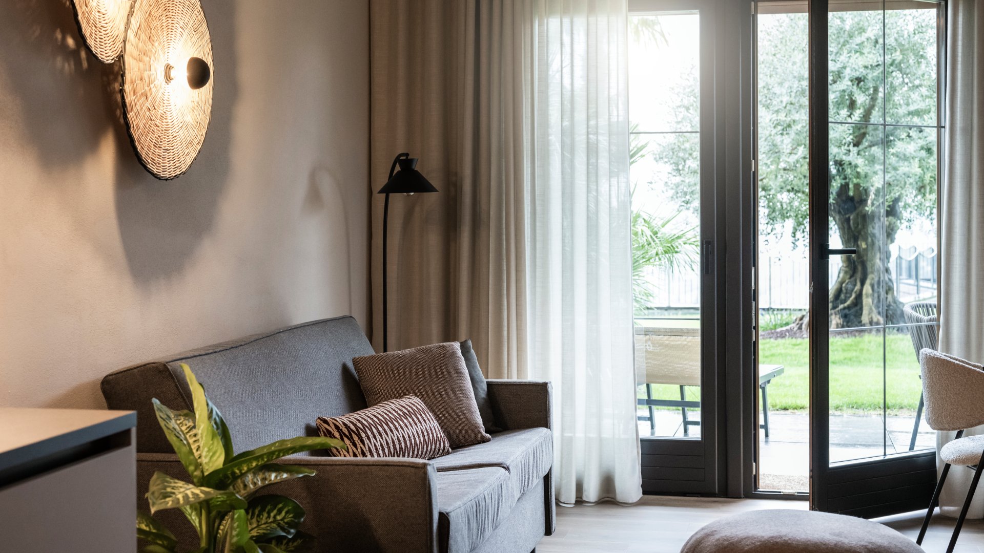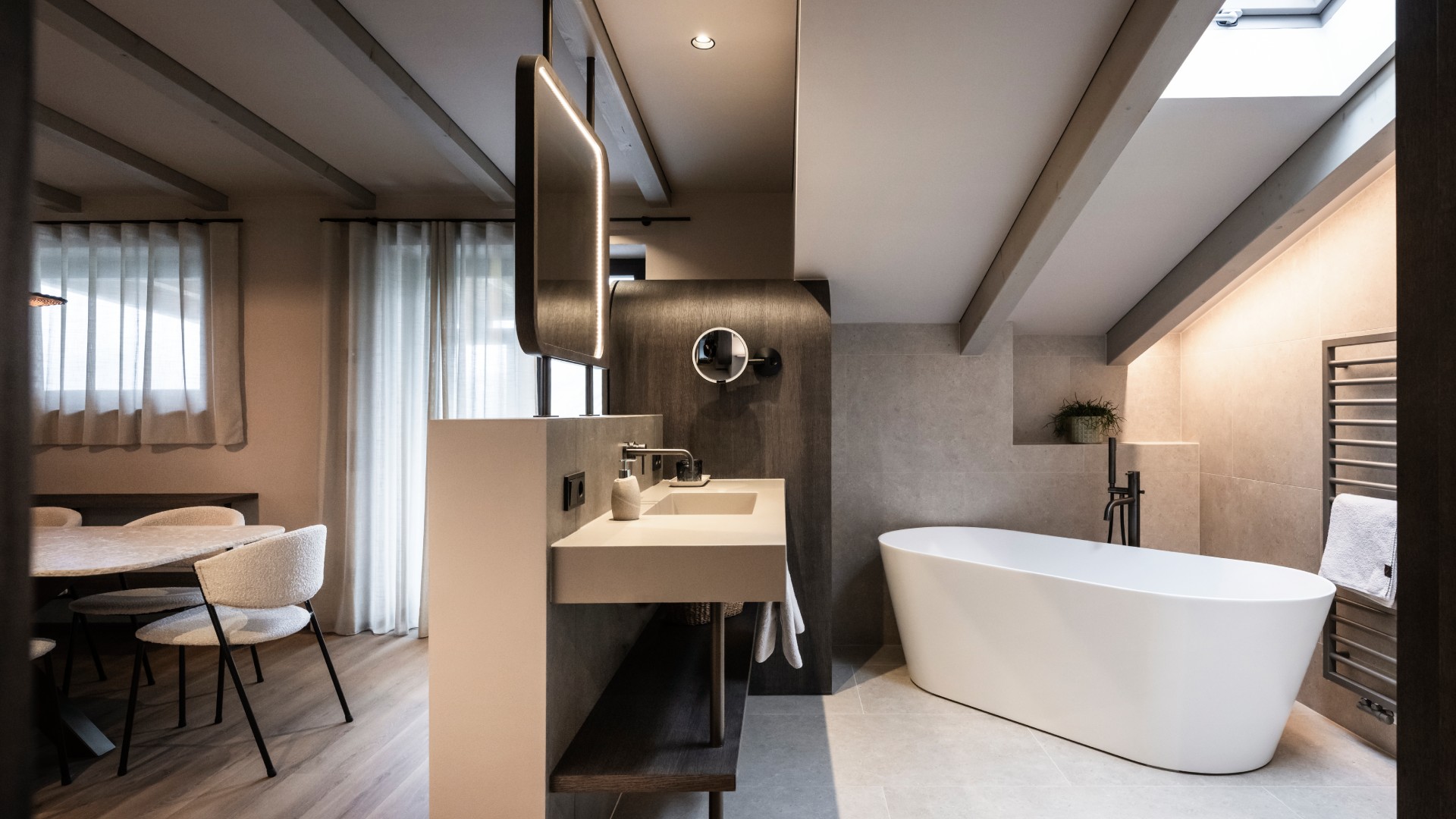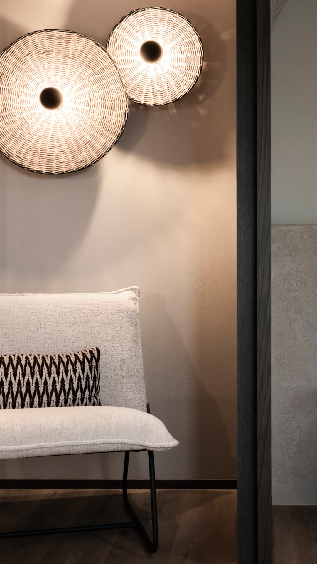 Στα δωμάτια, τα πάντα έχουν σχεδιαστεί για να εξασφαλίσουν συνέχεια και μια πλήρως καθηλωτική αισθητηριακή εμπειρία. Τα υλικά περιλαμβάνουν μέταλλο, ξύλο, ρατάν, κεραμικό και σοβά. Η χρωματική παλέτα είναι συγκρατημένη και διακριτική, με μοναδική εξαίρεση μια κοραλλί πινελιά στους τοίχους της κουζίνας και στα υφασμάτινα στοιχεία.