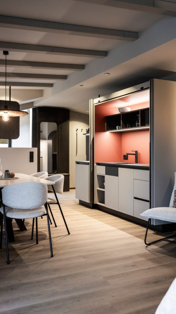 Η παραδοσιακή έννοια του δωματίου έχει επεκταθεί: μια πλήρως εξοπλισμένη ενότητα κουζίνας είναι ενσωματωμένη σε ένα ειδικό έπιπλο, το οποίο μπορεί να ανοίξει ή να κλείσει ανάλογα με τις ανάγκες. Παρά τη διατήρηση των υφιστάμενων ανοιγμάτων, οι νέες διατάξεις εξασφαλίζουν ομοιόμορφο φυσικό φως και μέγιστη ευρυχωρία. Οι δεκατρείς μονάδες, κατανεμημένες σε τέσσερις ορόφους, κυμαίνονται σε μέγεθος από 35 έως 65 τ.μ.