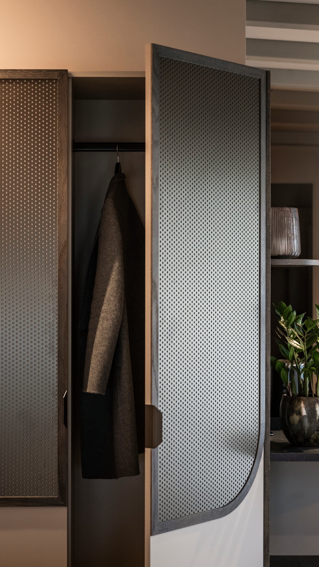 Επαναλαμβανόμενα στοιχεία δημιουργούν συνοχή μεταξύ των διαφορετικών χώρων: οι μεταλλικές ράβδοι, για παράδειγμα, γίνονται πολυλειτουργικά εξαρτήματα που, σαν τα κλαδιά ενός αναρριχώμενου φυτού, διασχίζουν το δωμάτιο, μεταμορφώνονται ανάλογα με την ανάγκη σε κρεμάστρες, λάμπες ή διάτρητα διαχωριστικά πάνελ. Οι οργανικοί, σε σχήμα δακρύου, καθρέφτες και τα απαλά στρογγυλεμένα κεφαλάρια συμβάλλουν επίσης στον καθορισμό ενός συνεχούς και περιβάλλοντος χώρου.