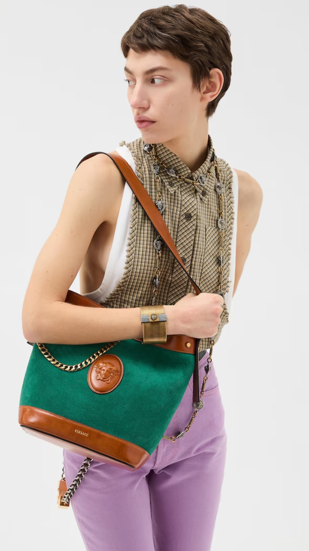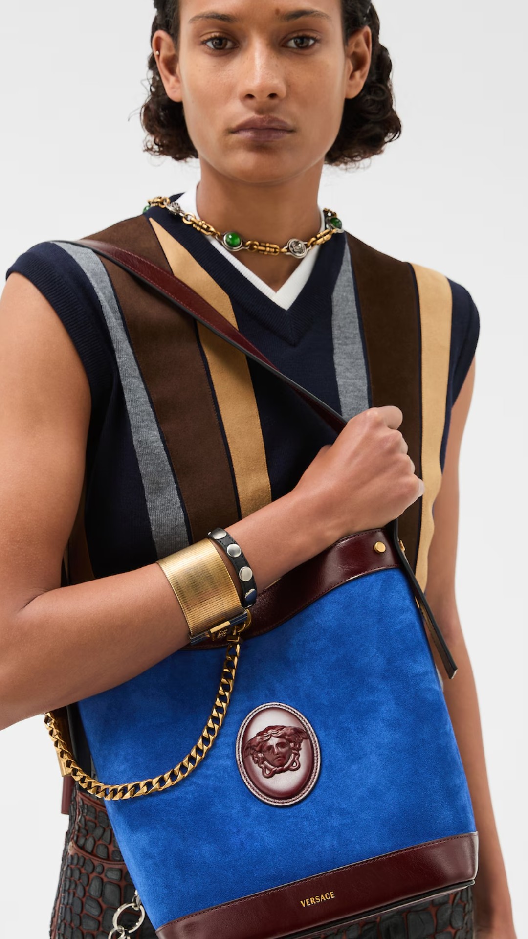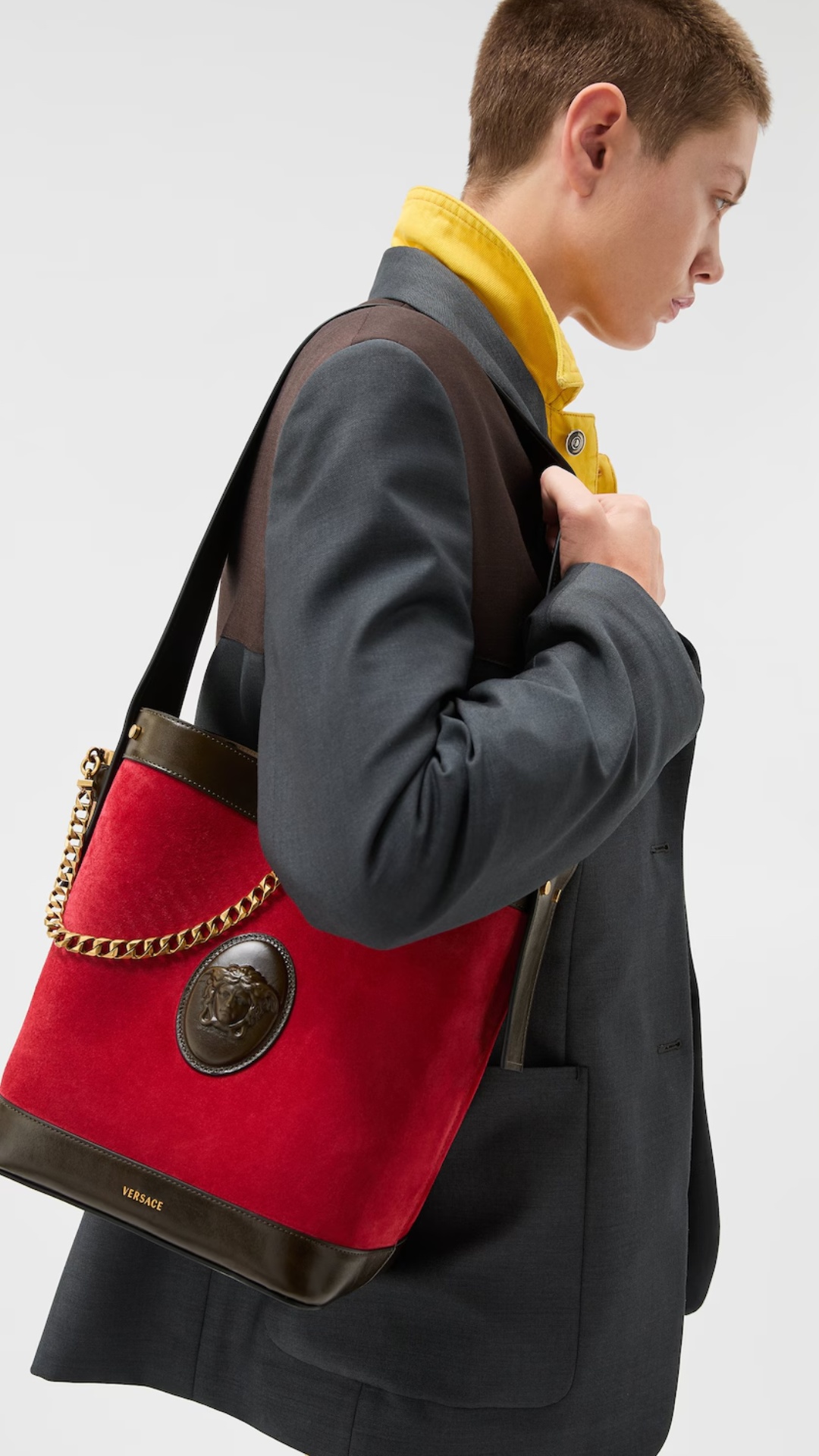 Επαναπροσδιορίζοντας την κλασική σιλουέτα της τσάντας «κουβά» (bucket bag), η νέα κυκλοφορία ξεχωρίζει για τα «χαρακτηριστικά μεταλλικά στοιχεία» της. Φυσικά αυτό που τραβάει όλα τα βλέμματα είναι το εμβληματικό έμβλημα της Μέδουσας.