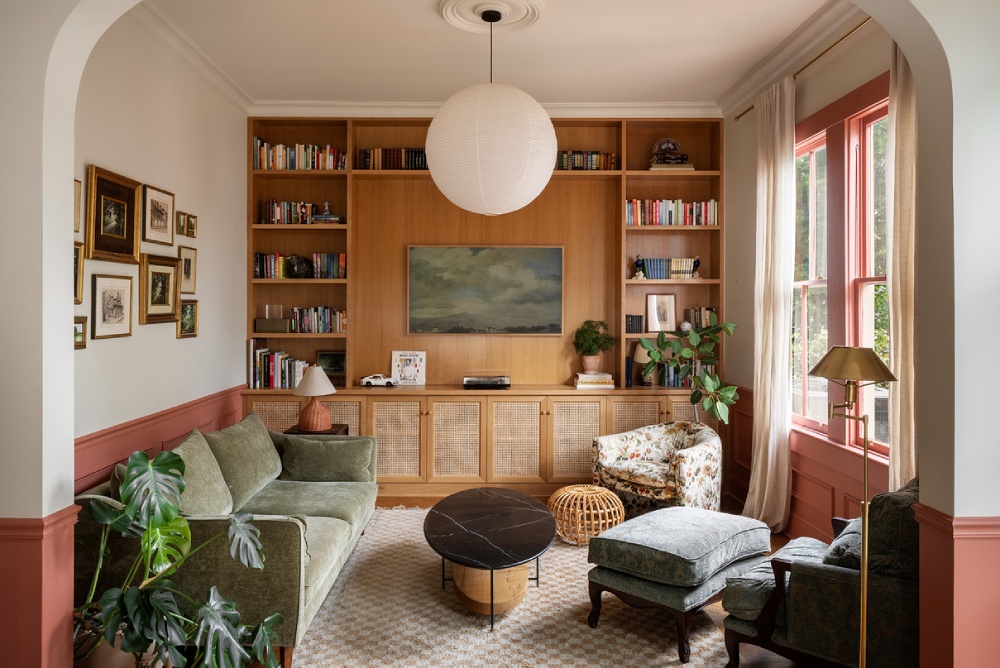 Μεγάλα “ιστορικά” παράθυρα επέτρεψαν το άφθονο φυσικό φως να πλημμυρίσει τον χώρο. Ένας προσεκτικά επιμελημένος συνδυασμός vintage και μοντέρνων επίπλων πρόσθεσε προσωπικότητα και ζεστασιά. Πρωταγωνιστικό ρόλο διαδραματίζει και το έπιπλο αποθήκευσης και προβολής της συλλογής βιβλίων των χρηστών. Τα υπνοδωμάτια αντικατοπτρίζουν έναν γραφικό χώρο που είναι ζεστός και φιλόξενος. Τέλος, η ταπετσαρία στα παιδικά δωμάτια είναι αυτή που φέρνει τον παιχνιδιάρικο χαρακτήρα.