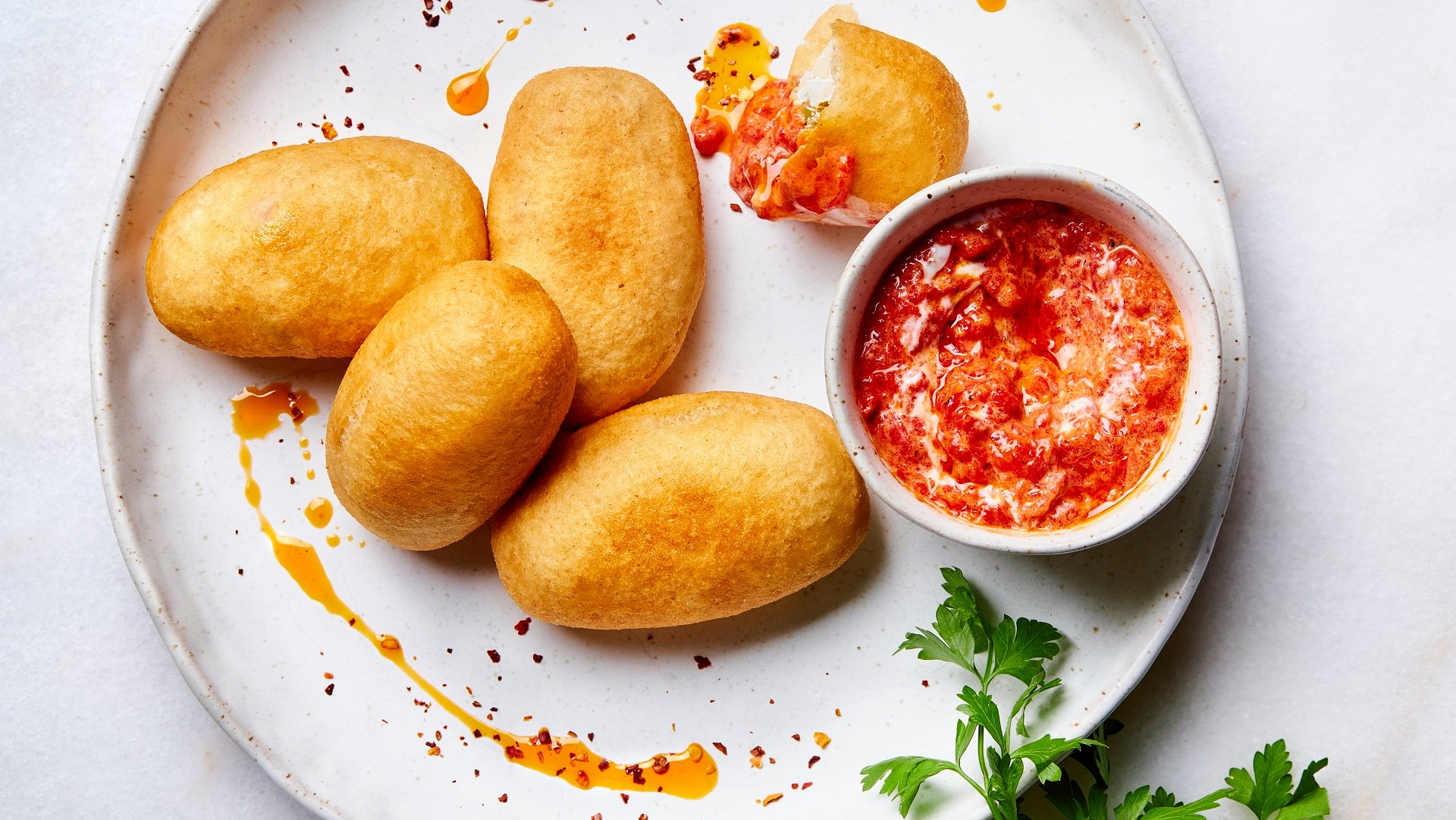 Σε ένα μπολ, βάζουμε το χλιαρό νερό και προσθέτουμε την ξηρή μαγιά. Ανακατεύουμε μέχρι να διαλυθεί. Σε κάδο του μίξερ με γάντζο, τοποθετούμε το αλεύρι, το αλάτι και τη ζάχαρη. Στη συνέχεια προσθέτουμε τη διαλυμένη μαγιά και ζυμώνουμε μέχρι να έχουμε μια απαλή ζύμη. Αφήνουμε τη ζύμη να ξεκουραστεί, μέχρι να διπλασιαστεί σε όγκο. Φτιάχνουμε μπαλάκια 30 γρ., τα ανοίγουμε με πλάστη, τοποθετούμε μέσα γέμιση, κλείνουμε πολύ καλά και τηγανίζουμε στους 160-170οC, μέχρι να ροδίσουν.