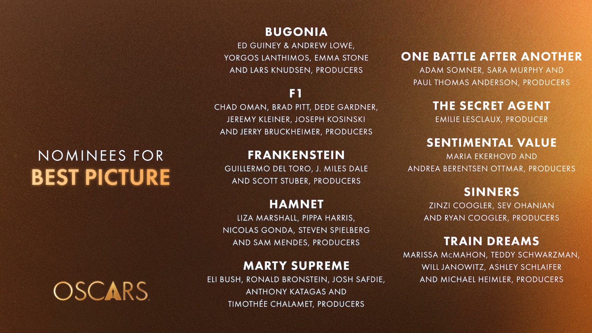 Με συνολικά 16 υποψηφιότητες συνέτριψε το ψυχολογικό όριο των 14, που είχε το «All About Eve» (1950) το οποίο είχαν ισοφαρίσει ο «Τιτανικός» (1997) και το «La La Land» (2016). Ακολουθεί με 13 υποψηφιότητες η επική Αμερικανική ταινία δράσης «One Battle After Another» (Μια Μάχη Μετά την Άλλη) του Πολ Τόμας Άντερσον. Το βραβείο καλύτερης ταινίας διεκδικεί η ταινία «Bugonia» του Γιώργου Λάνθιμου καθώς και τα βραβεία για τον α’ γυναικείο ρόλο, διασκευασμένου σεναρίου και μουσικής.