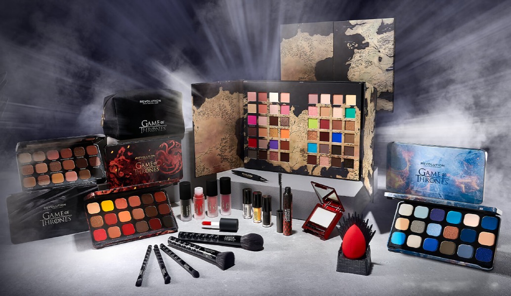 Τι περιλαμβάνει η νέα φανταστική Revolution συλλογή εμπνευσμένη από τη σειρά; Οι παλέτες σκιών κλέβουν την παράσταση! Αυτή που μοιάζει με χάρτη του Westeros περιλαμβάνει μία τεράστια ποικιλία αποχρώσεων που πήραν το όνομά τους από τις signature περιοχές της σειράς. Υπάρχουν και τρεις παλέτες σε μικρότερα μεγέθη, οι Mother of dragons, Winter is coming και Raven Forever.