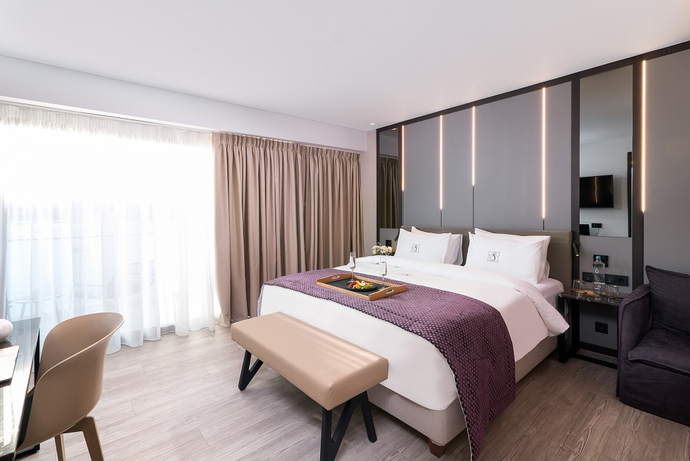 Στο interior design των δωματίων έχει υιοθετηθεί η minimal σχεδιαστική προσέγγιση, ενώ η χρωματική παλέτα κινείται σε ήσυχα μονοπάτια. Ξύλινα πατώματα, γραμμικά μοτίβα σε ξύλινα διαχωριστικά, κρυφοί φωτισμοί, μοντέρνοι ανοιχτοί αποθηκευτικοί χώροι και μαρμάρινα μπάνια συνθέτουν τον χώρο των υψηλής αισθητικής δωματίων. Εντυπωσιάζουν οι νιπτήρες ελεύθερης τοποθέτησης στο κέντρο κάθε δωματίου, δείγμα μιας σύγχρονης interior φιλοσοφίας.Τα μεγάλα ανοίγματα στα δωμάτια συνοδεύονται από εξίσου μεγάλα και άνετα μπαλκόνια, στοιχείο που δύσκολα συναντά κανείς σε ένα καθαρόαιμο urban hotel.