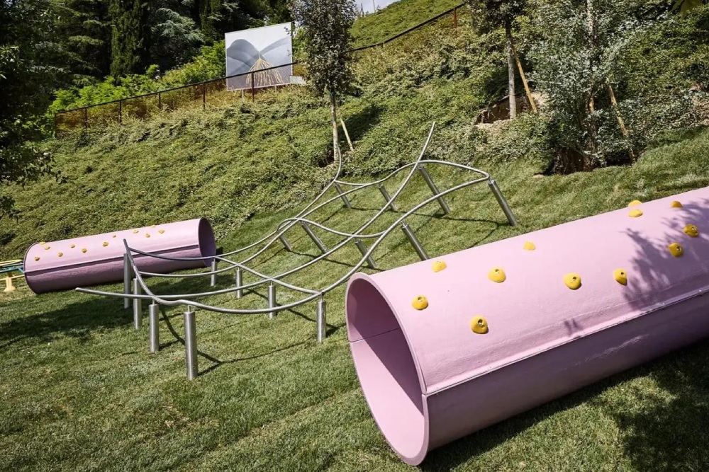 «Χάρη στην κλίση του εδάφους, οι μονάδες προσκαλούν αγόρια και κορίτσια να σκαρφαλώσουν και να κουνηθούν, μαθαίνοντας να κρατούν την ισορροπία τους, με τις δικές τους δεξιότητες και με την ανάγκη να παραμείνουν συγκεντρωμένοι. Το γλυπτό του Sanya Kantarovsky, τοποθετημένο δίπλα στην εγκατάσταση, ενσαρκώνει έναν διαφορετικό τρόπο συνδυασμένης πρακτικής της τέχνης και του παιχνιδιού».