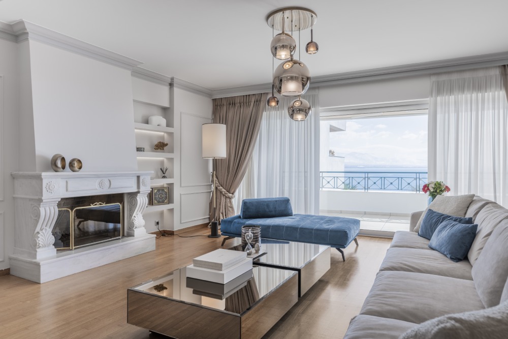 Στο σαλόνι, τα έπιπλα τοποθετήθηκαν σχεδόν κυκλικά απέναντι από τη θέα που απλώνεται ανεμπόδιστα έξω από το μεγάλο άνοιγμα του παραθύρου, με στόχο να μην εμποδιστεί στο ελάχιστο η είσοδος του απέραντου γαλάζιου στον χώρο διημέρευσης της οικογένειας. Η αίσθηση πολυτέλειας είναι διάχυτη, χωρίς ωστόσο να θυσιάζει τη λειτουργικότητα του χώρου. Για την επίπλωση του σαλονιού οι interior designers επέλεξαν μια ουδέτερη χρωματική παλέτα, που διακόπτεται από ελάχιστες μπλε πινελιές.