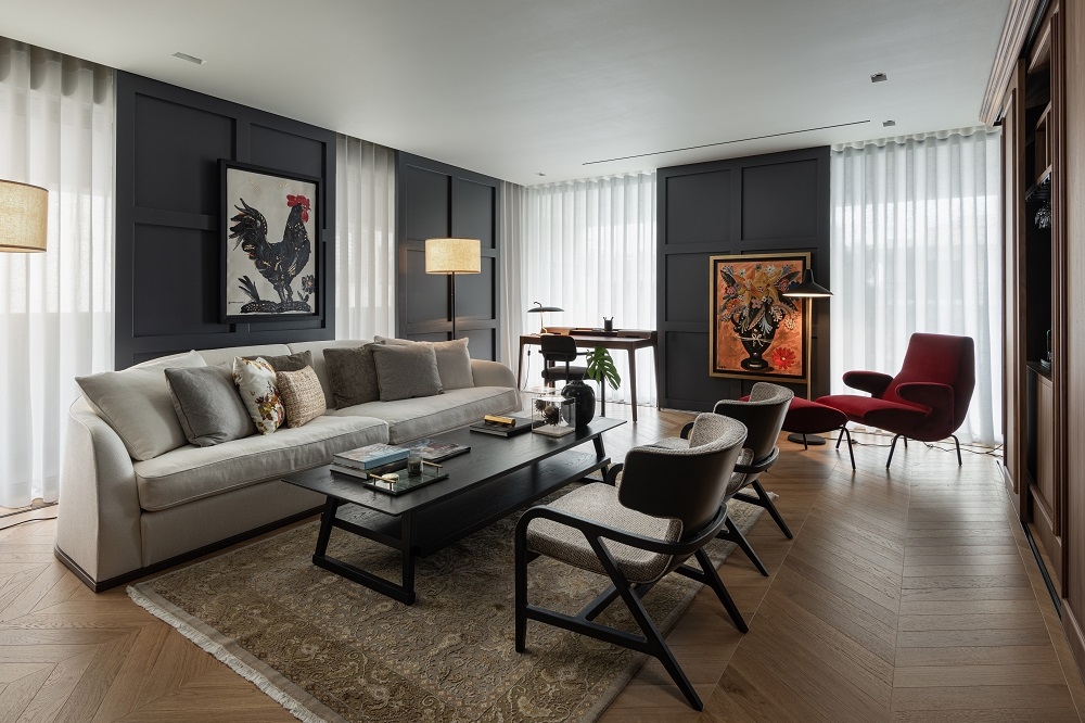Το βρετανικό ύφος και η εκλεκτική διάθεση είναι τα κυρίαρχα χαρακτηριστικά.που καθόρισαν την αισθητική προσέγγιση του Single Apartment. Το ξύλινο δάπεδο, συνδυαστικά με τις μαρμάρινες επιφάνειες,.τα μεταλλικά στοιχεία, τις διαφορετικές υφές και τις ταπετσαρίες συνοψίζουν την παλέτα των υλικών,.ενώ, παράλληλα, η επιλογή των έργων τέχνης και του φωτισμού δημιουργούν έναν χώρο.με ξεχωριστή ατμόσφαιρα, η οποία αποπνέει την αύρα του ιδιοκτήτη.