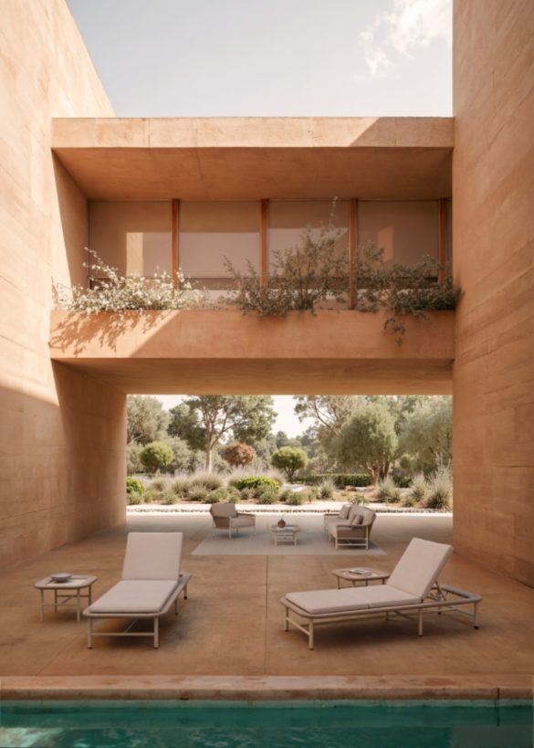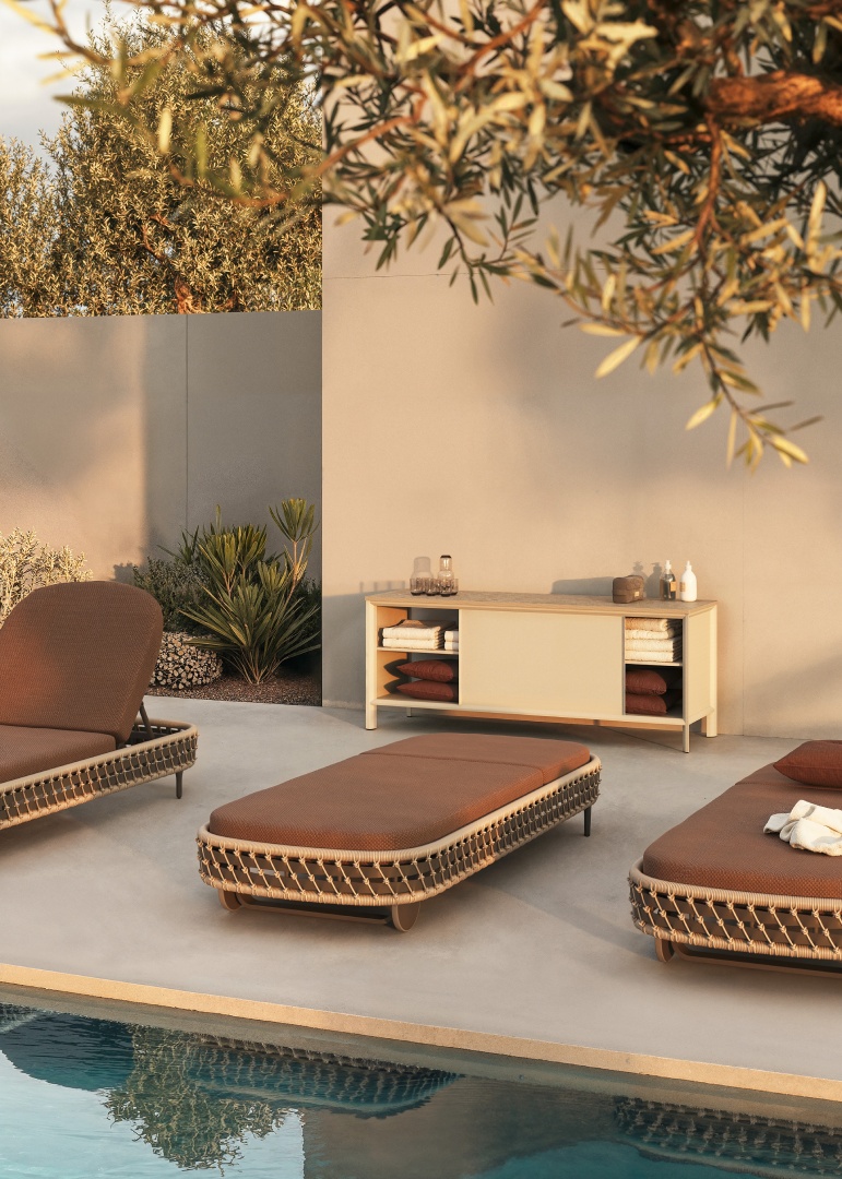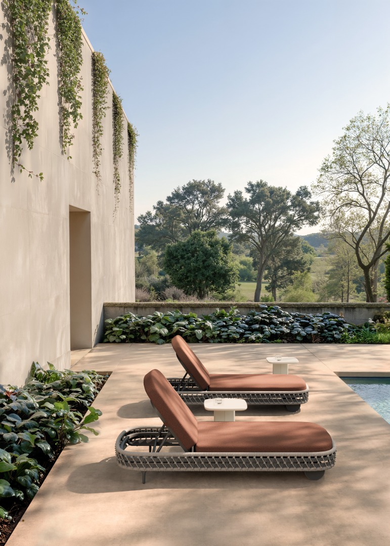 Μια όαση χαλάρωσης δημιουργήθηκε από το ανάκλιντρο (daybed) της συλλογής Serra σχεδιασμένο από τους Kay Durán & Miguel López στην έκδοση White Wash. Η συλλογή Serra αντλεί στοιχεία από την ουσία των κλασικών καρεκλών rattan και προσφέρει ένα τολμηρό design που συνδυάζει τα παραδοσιακά πλεκτά καθίσματα με κομψά μεταλλικά πόδια, ξεφεύγοντας από τη συμβατική αισθητική.