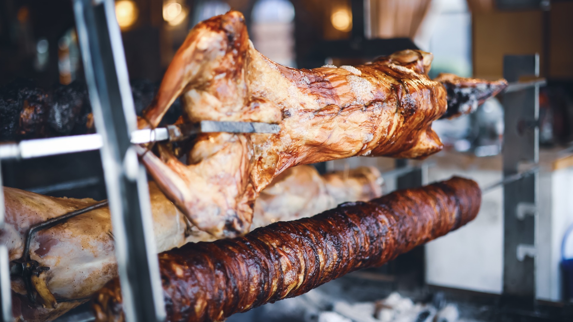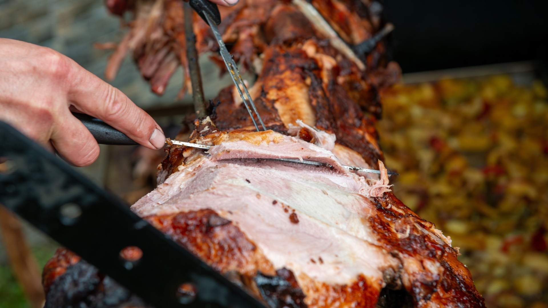 Συνοδευτικά, όπως πατάτες φούρνου, σαλάτες, τυριά και παραδοσιακά ψωμιά, συμπληρώνουν το τραπέζι, ενώ το κρασί και τα τοπικά αποστάγματα ενισχύουν τον εορταστικό χαρακτήρα.