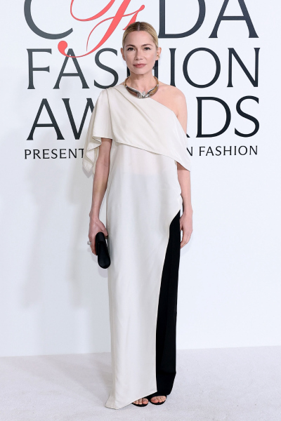 Η Michelle Williams επέλεξε ένα ασύμμετρο λευκό φόρεμα με μαύρη λωρίδα στο πλάι και ανοιχτό τον έναν ώμο. Το outfit ολοκληρώθηκε με ένα εντυπωσιακό μεταλλικό κολιέ, μαύρη τσάντα και πέδιλα.
