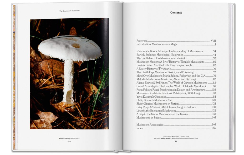 Αυτή η πλούσια συλλογή συνδυάζει τη χαρακτηριστική προσέγγιση του περιοδικού The Gourmand, που ενώνει τη μαγειρική τέχνη με την πολιτιστική έρευνα. Συνοδευόμενο από φωτογραφίες που αναδεικνύουν τα μυκητολογικά θαύματα ως γλυπτά, μοτίβα και φόρμες, το βιβλίο προσφέρει δοκίμια που εκτείνονται από την αρχαία λαογραφία και την τοξικολογία μέχρι την avant-garde τέχνη, την αρχιτεκτονική, τη μόδα, τον κινηματογράφο και τα διαστημικά ταξίδια.