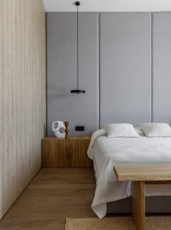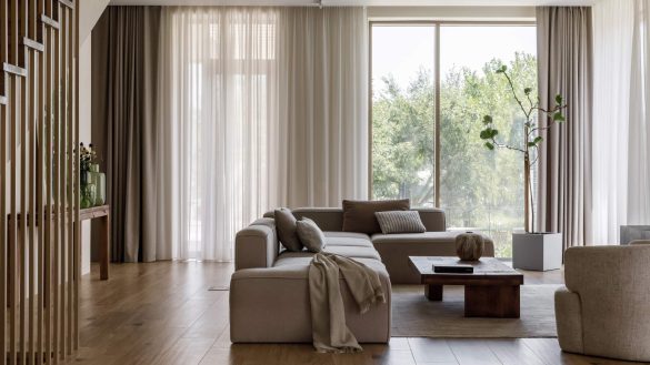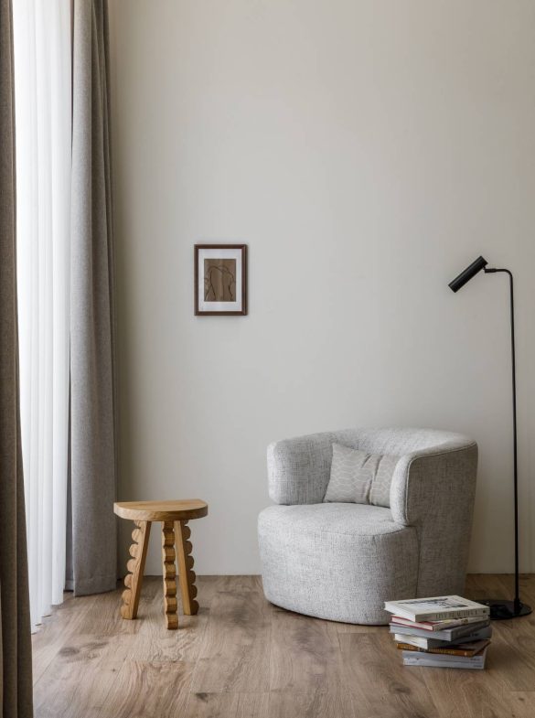 Η βασική αρχή του σχεδιασμού ήταν ο συνδυασμός σύγχρονης αρχιτεκτονικής και τεχνολογίας με αίσθηση οικειότητας. Παρά τη χρήση υλικών όπως το εμφανές σκυρόδεμα, η ατμόσφαιρα παραμένει θερμή χάρη στην εκτεταμένη χρήση φυσικού ξύλου, το οποίο λειτουργεί ως ενοποιητικό στοιχείο σε όλους τους χώρους. Συμπληρωματικά χρησιμοποιήθηκαν φυσική πέτρα και απτικά υφάσματα, ενώ η χρωματική παλέτα κινείται σε ουδέτερους τόνους μπεζ και γκρι, με έμφαση στις υφές και όχι στις αντιθέσεις.