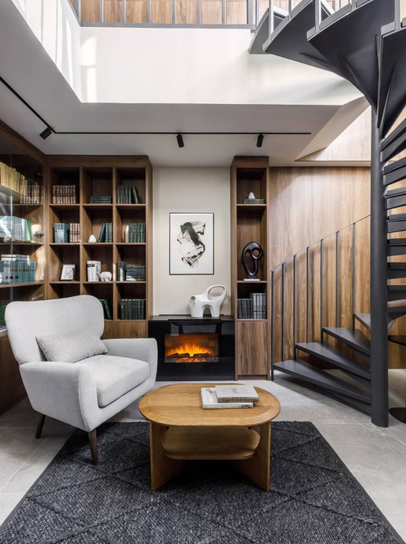 Κομβικό στοιχείο της αρχιτεκτονικής σύνθεσης αποτελεί η διώροφη βιβλιοθήκη, η οποία προστέθηκε κατά τη φάση της κατασκευής. Ο χώρος αναπτύσσεται σε διπλό ύψος και συνδέεται με υπόγεια επέκταση, δημιουργώντας ενδιαφέρουσες οπτικές φυγές και μια δυναμική εμπειρία κίνησης. Ιδιαίτερη σημασία έχει και το πανοραμικό γωνιακό παράθυρο στο παιδικό δωμάτιο, μήκους άνω των πέντε μέτρων χωρίς ενδιάμεση στήριξη, που καταργεί οπτικά τα όρια και ενοποιεί τον εσωτερικό χώρο με τον κήπο.