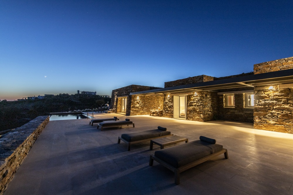 Τόσο στο εσωτερικό, όσο και στο εξωτερικό των κτισμάτων, η φύση αναδεικνύεται σε απόλυτο πρωταγωνιστή. Κατασκευασμένες εξολοκλήρου από σχιστολιθική πέτρα, οι προσόψεις των κτιρίων εναρμονίζονται απόλυτα με το ευρύτερο περιβάλλον. Η ολιστική προσέγγιση σχεδιασμού εντείνεται και από την επιλογή των αρχιτεκτόνων να καλύψουν τις στέγες με χώμα και κυκλαδίτικη φύτευση. Η ίδια φύτευση συνεχίζεται και στον υπόλοιπο περιβάλλοντα χώρο, όπου εμπλουτίζεται με δέντρα, κυρίως ελιές. Εντυπωσιακοί χώροι belvedere, μια πισίνα, που φαντάζει ως φυσική συνέχεια της θάλασσας, και ένα μικρό αμφιθέατρο, για προβολές κινηματογράφου κατά τους μήνες του θέρους, ολοκληρώνουν την εξωτερική εικόνα των τριών κατοικιών.