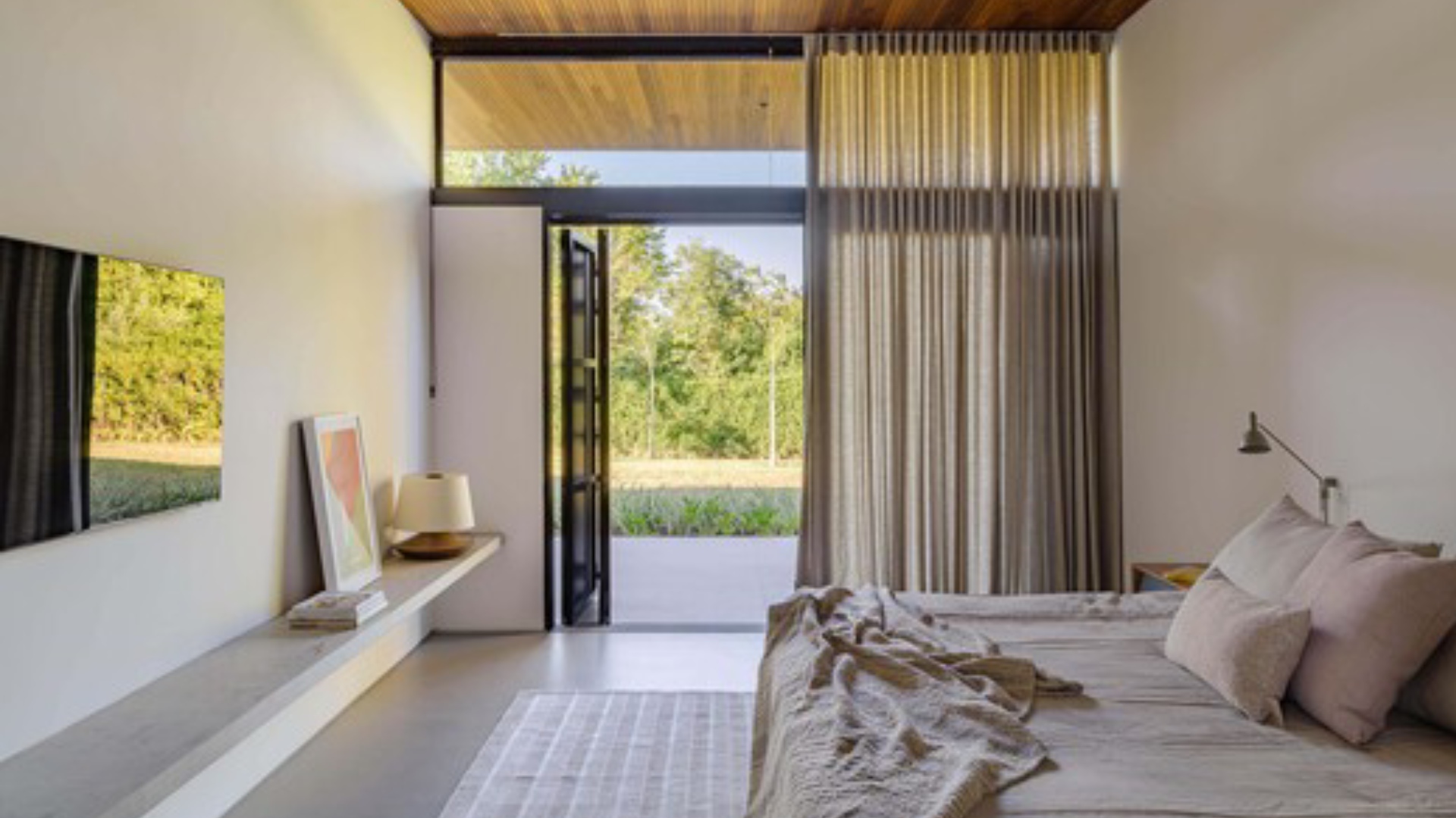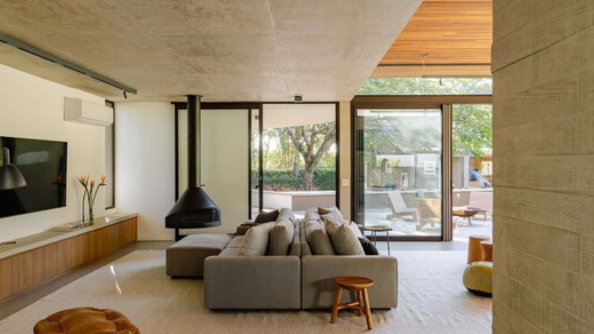 Το ξύλο freijó, παρόν στις οροφές και τα εντοιχισμένα έπιπλα, εισάγει ζεστασιά, εξισορροπώντας τη στιβαρότητα των υλικών.