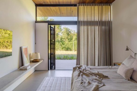 Ο δεύτερος όγκος συγκεντρώνει το ιδιωτικό πρόγραμμα, με τρεις σουίτες σχεδιασμένες να διασφαλίζουν την ιδιωτικότητα, την περιβαλλοντική άνεση και ποιοτική θέα προς την υπάρχουσα βλάστηση. Και οι δύο όγκοι είναι κατασκευασμένοι με αναρτημένους μεταλλικούς σκελετούς, μια λύση που επιτρέπει τον έμμεσο φωτισμό, ενισχύει τον αερισμό και προσδίδει ελαφρότητα στο σύνολο. Η οροφή από ξύλο freijó διατρέχει συνεχόμενα τους χώρους, παρέχοντας θερμική και οπτική άνεση, ενώ ενισχύει τον οριζόντιο χαρακτήρα της αρχιτεκτονικής.