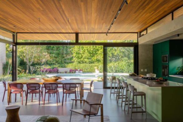 Η ενιαία κουζίνα αναλαμβάνει κεντρικό ρόλο στον κοινωνικό όγκο. Ο πάγκος από μάρμαρο Paraná συνομιλεί με τη δομή του κτιρίου, ενώ τα ντουλάπια σε αποχρώσεις του πράσινου δημιουργούν μια άμεση σχέση με την εξωτερική βλάστηση.