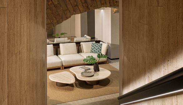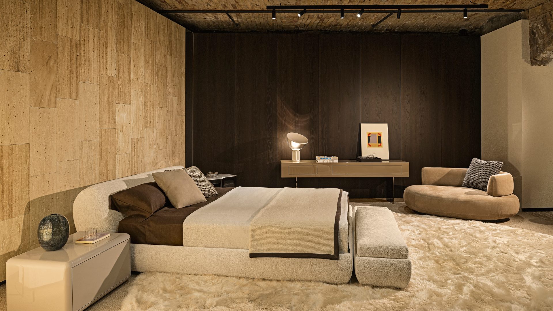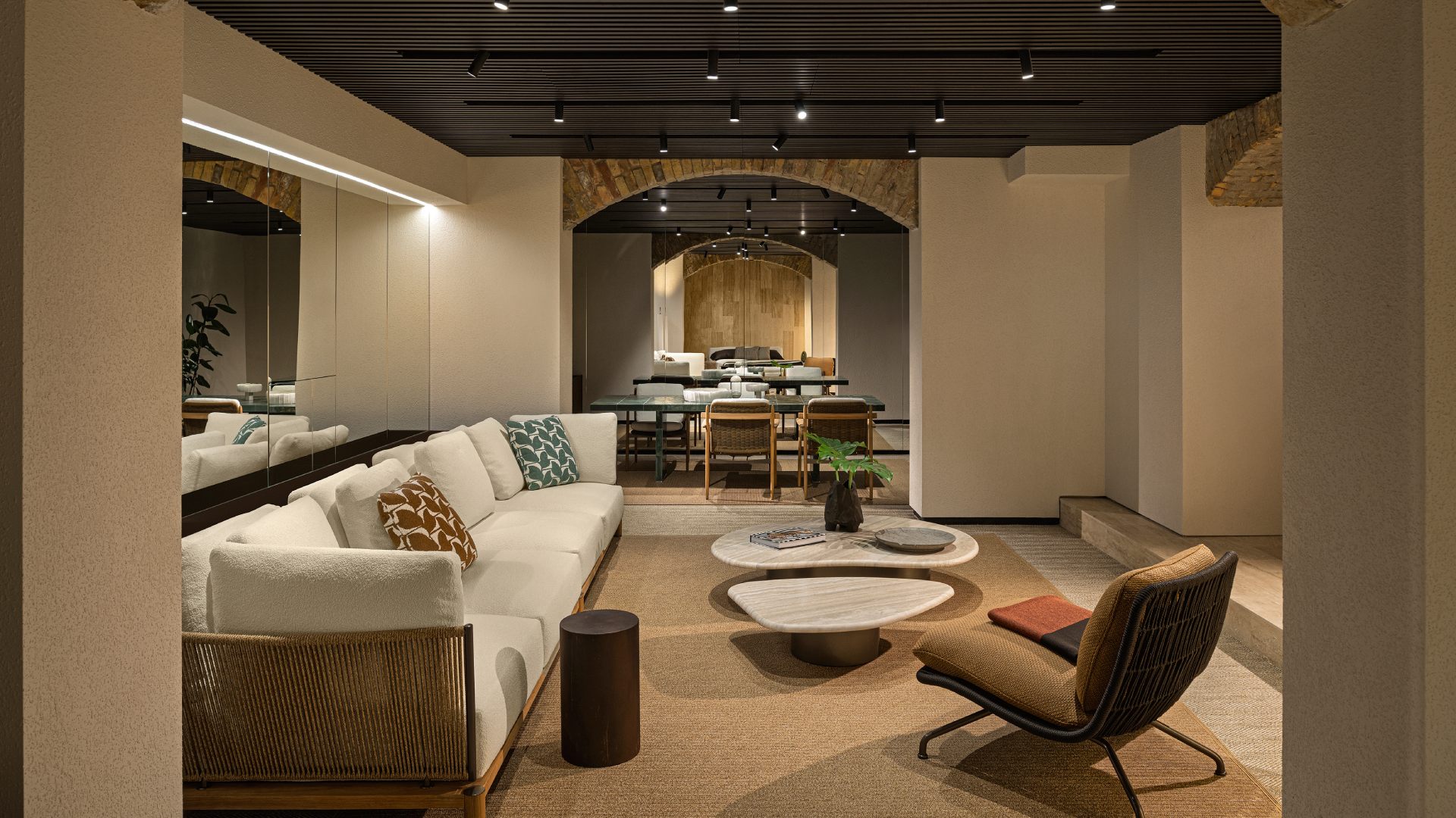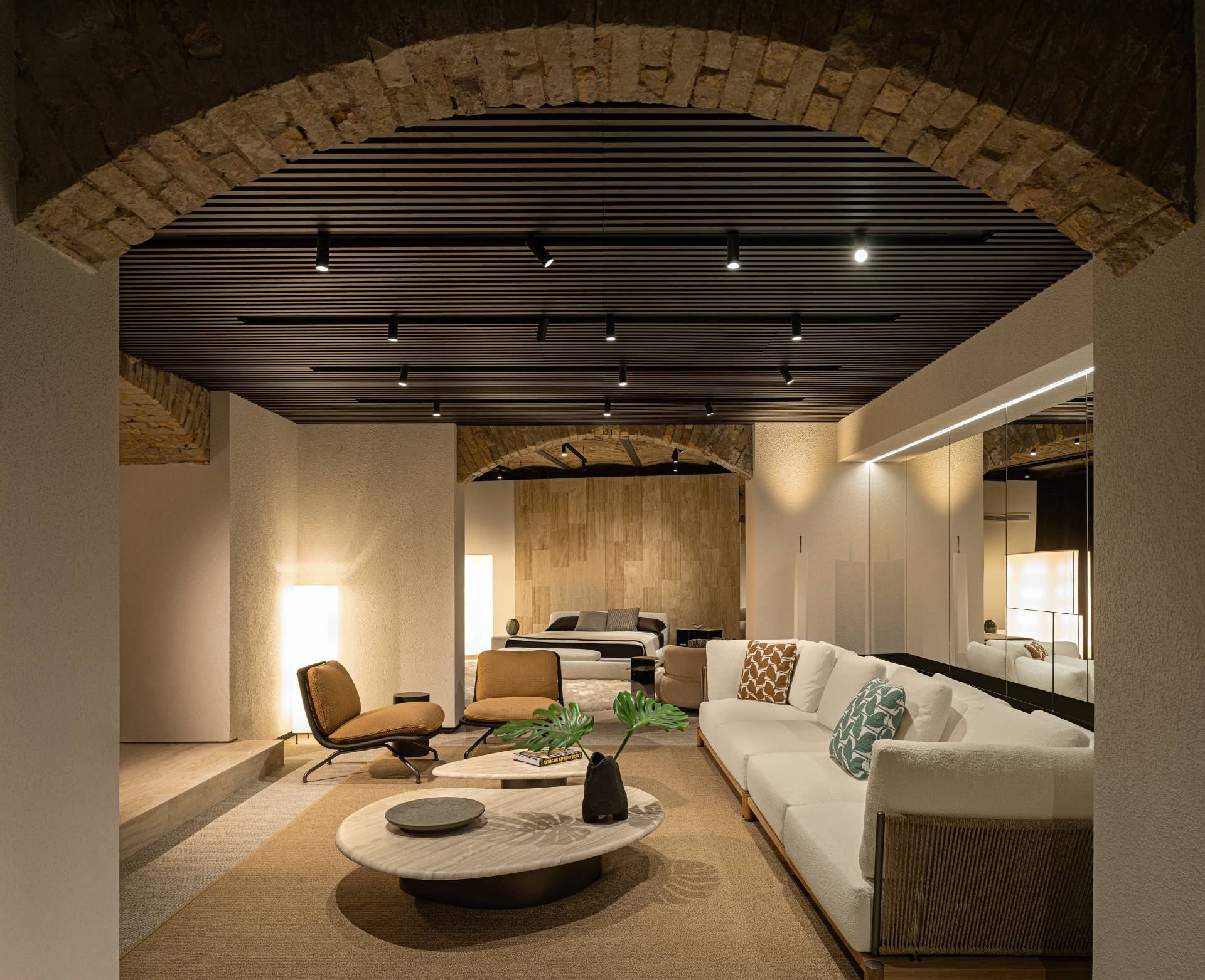 Το κάτω επίπεδο ολοκληρώνεται με δύο εξωτερικούς χώρους και έναν χώρο υπνοδωματίου. Θολωτές οροφές, εσοχές από εμφανή τούβλα και ξύλινες επενδύσεις τοίχων δημιουργούν μια ζεστή, αυθεντική ατμόσφαιρα όπου η ταυτότητα της Minotti εκφράζεται με κομψότητα και συνέπεια.