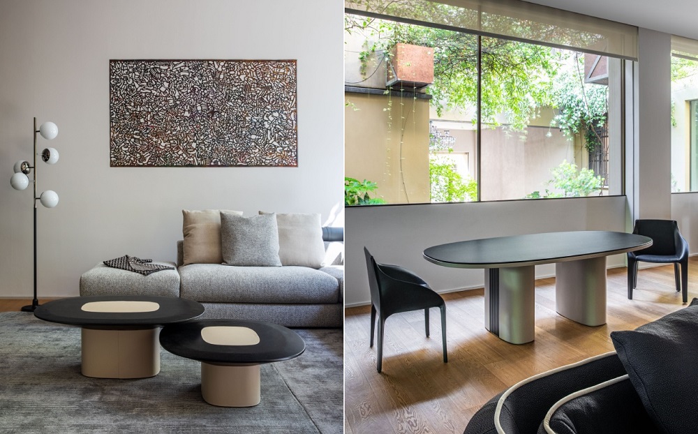 Η απτότητα καιη αφαιρετικότητα συγχωνεύονται σε αυτή τη συλλογή τραπεζιών,.που διατίθενται σε διάφορα σχήματα και μεγέθη, σχεδιασμένα από τον Antonio Facco. Το στούντιο σχεδίασής του με έδρα το Μιλάνο αναπτύσσει πολυεπιστημονικά έργα.και συνδυάζει εσωτερική διακόσμηση, γραφιστική και φωτογραφία. Η ουσιαστική βάση των τραπεζιών αποτελείται από δύο γλυπτά πόδια διακοσμημένα με μαρμάρινα ένθετα,.ενώ οι λεπτομέρειες που θυμίζουν πέτρινες φλέβες κάνουν την επιφάνεια πιο δυναμική και φωτεινή.