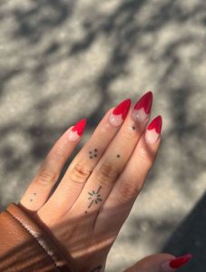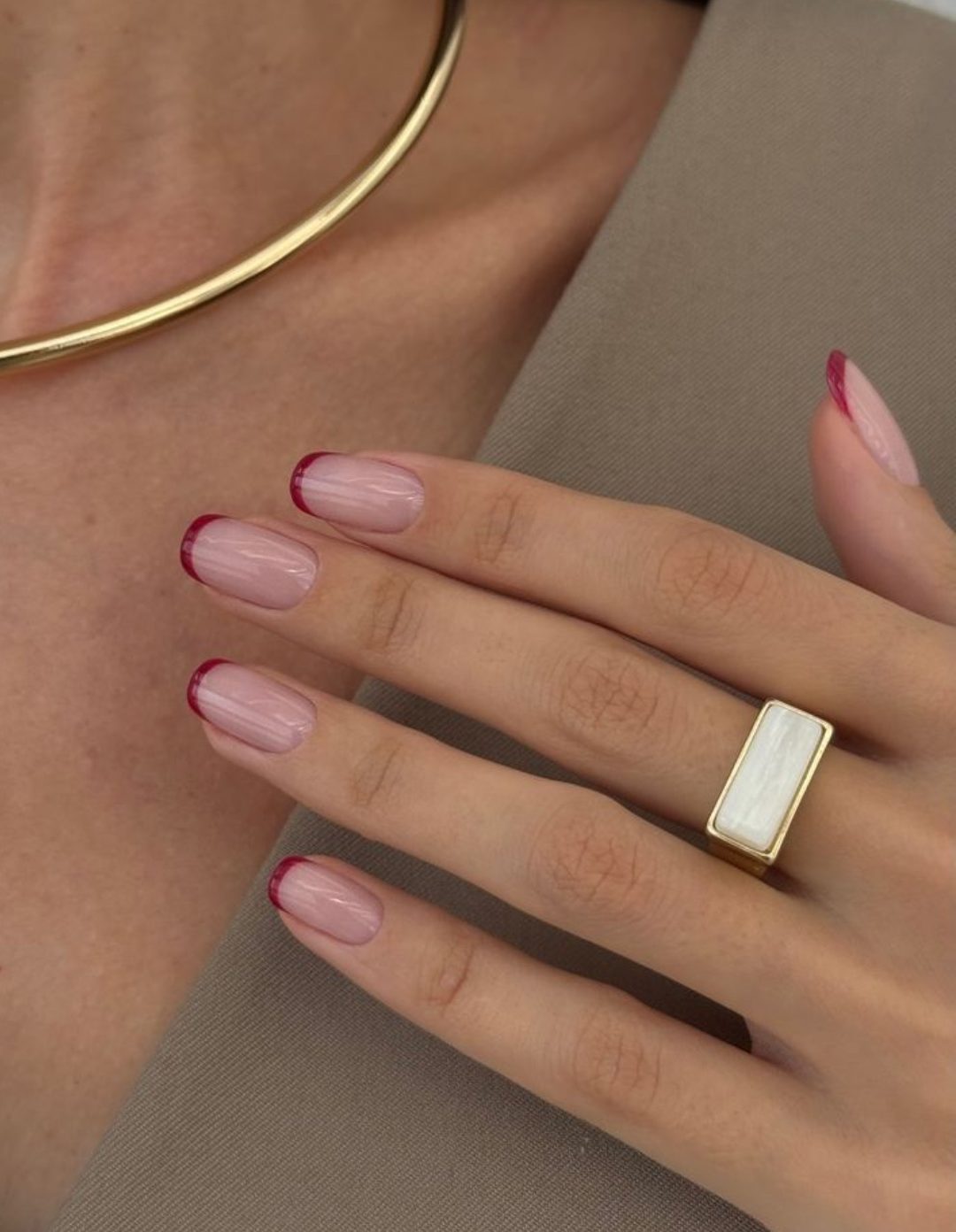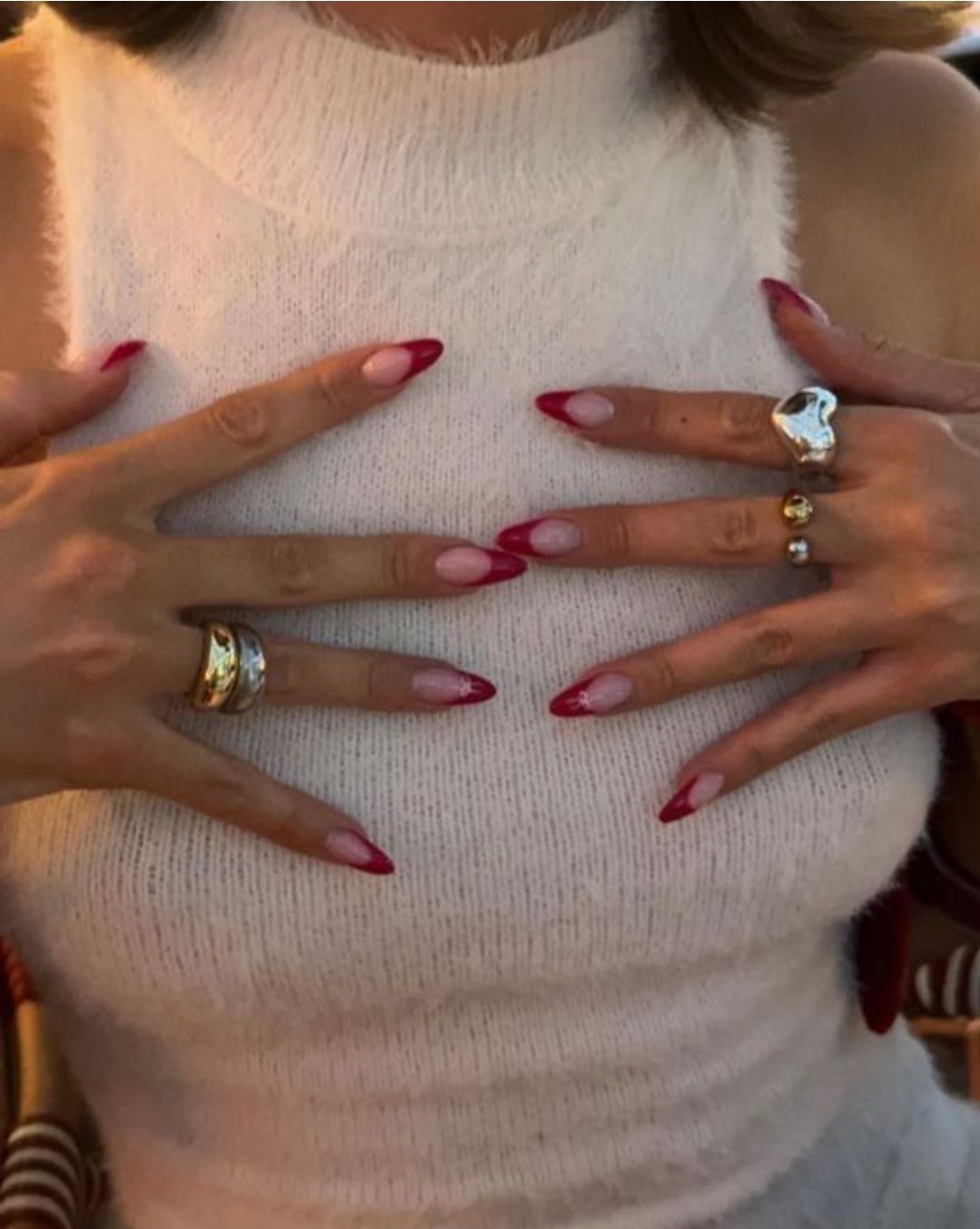 Το γαλλικό μανικιούρ ανανεώνεται και αποκτά Valentine διάθεση με κόκκινα tips. Το κόκκινο γαλλικό είναι κομψό, θηλυκό και ιδανικό για όσες θέλουν κάτι διαφορετικό χωρίς να ξεφεύγουν από το minimal. Ταιριάζει υπέροχα σε almond αλλά και σε square νύχια, ενώ μπορεί να φορεθεί άνετα και μετά τις γιορτινές ημέρες.