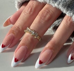 Το κλασικό γαλλικό μανικιούρ παραμένει πάντα επίκαιρο, αλλά με μια μικρή κόκκινη καρδιά αποκτά playful και Valentine χαρακτήρα. Η λεπτομέρεια αυτή προσθέτει τσαχπινιά χωρίς να αλλοιώνει τη διαχρονική κομψότητα του γαλλικού. Είναι η ιδανική επιλογή αν θέλεις κάτι safe αλλά όχι βαρετό.