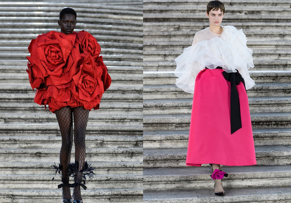 Φυσικά, το signature κόκκινο χρώμα, συνυφασμένο με τον οίκο Valentino, είχε την τιμητική του. Θηλυκές γραμμές, τεράστια λουλούδια, αέρινα υφάσματα… Μαγεία, σαγήνη, τελειότητα! Οι αναφορές σε παλαιότερες, αγαπημένες δημιουργίες του οίκου ήταν προφανείς, όπως στο πρώτο κατακόκκινο φόρεμα Valentino με την ονομασία “Fiesta” του 1959. Τα τρισδιάστατα τριαντάφυλλα ήταν βασική λεπτομέρεια σε πολλά ρούχα. Chiffon, οrganza και τούλι, φτερά και όγκοι χαρακτηρίζουν τη συλλογή.