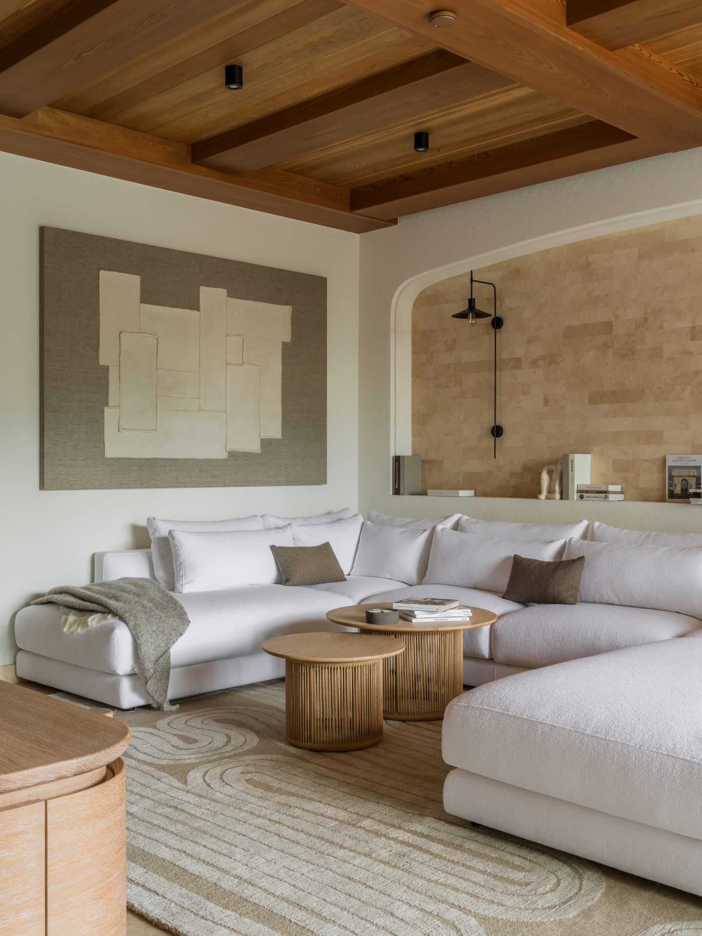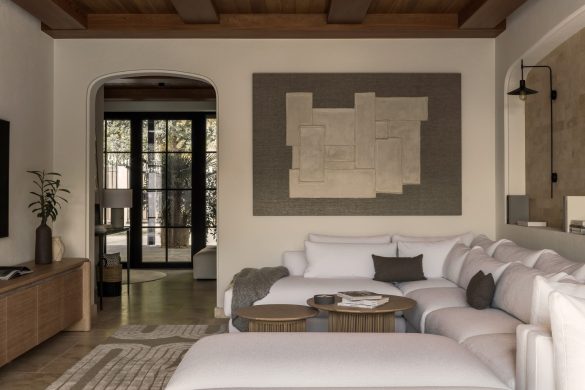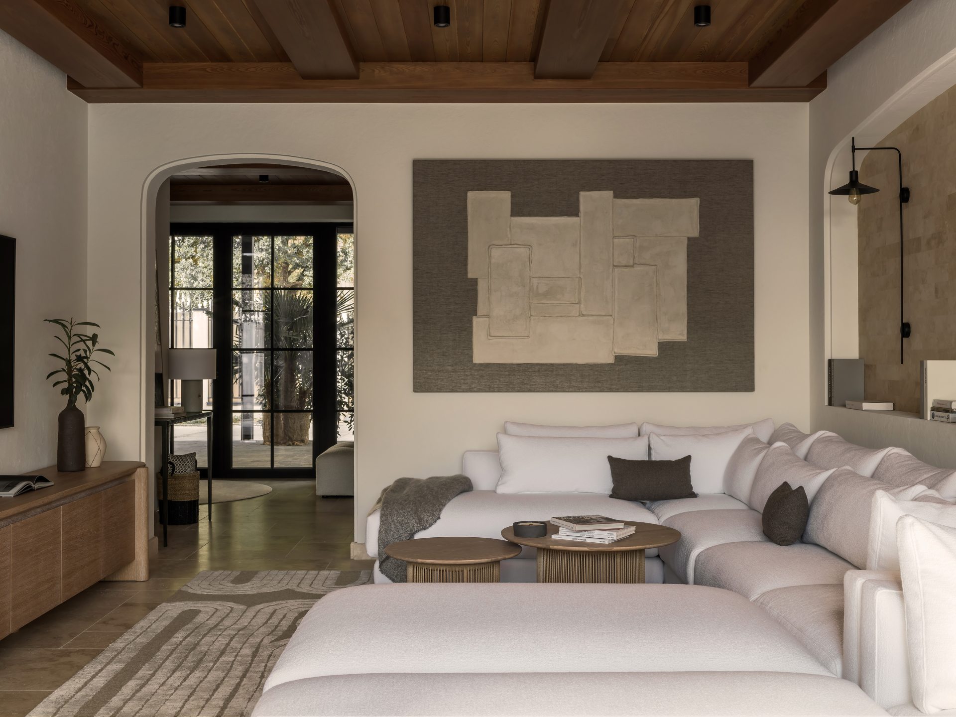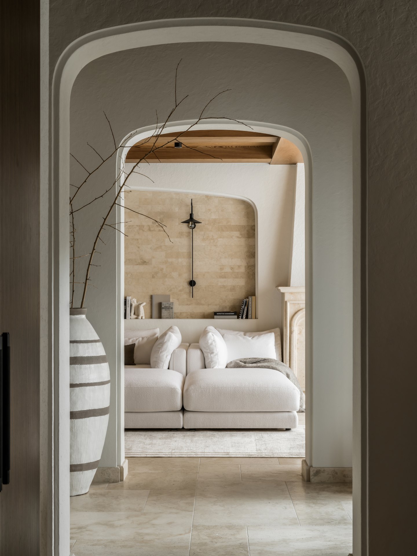 Το καθιστικό αποτελεί το κέντρο μιας διάταξης “enfilade”, όπου τοξωτά ανοίγματα δημιουργούν βάθος και ροή. Κεντρικό στοιχείο είναι ο αρθρωτός καναπές Narvik, ενώ η αρχιτεκτονική καμάρα επαναλαμβάνεται σε μια απαλά καμπυλωτή κόγχη-βιβλιοθήκη.