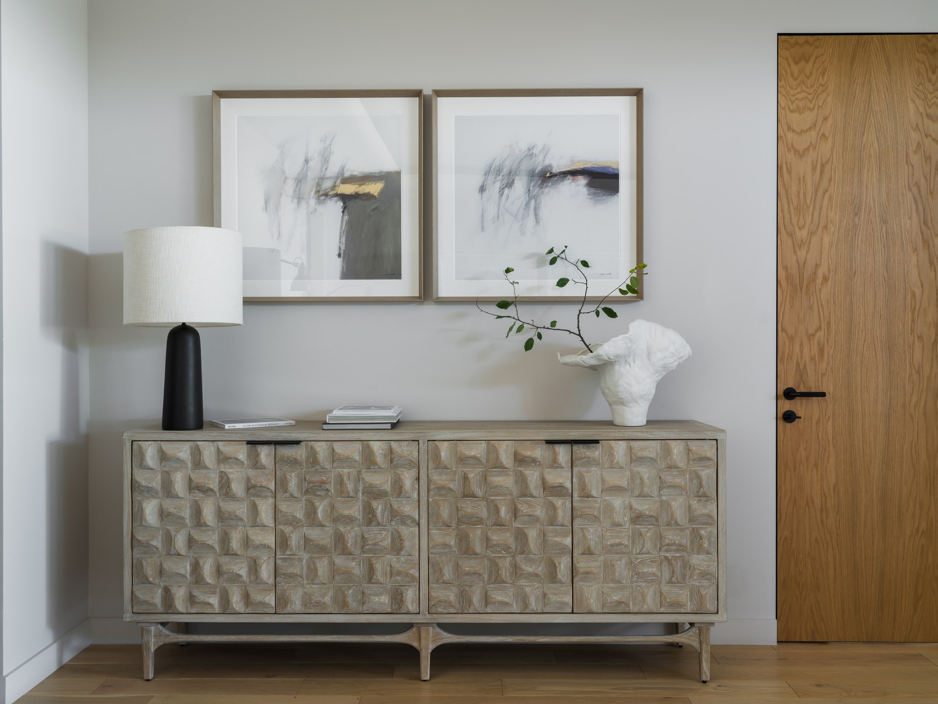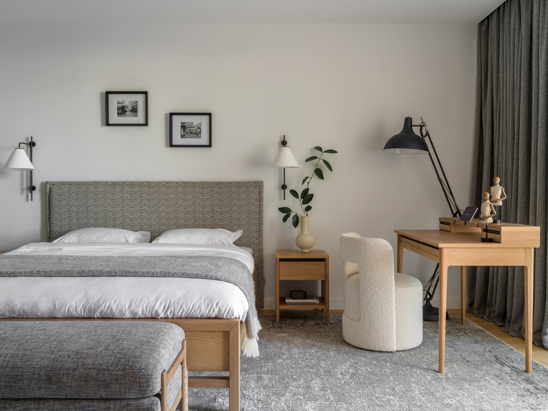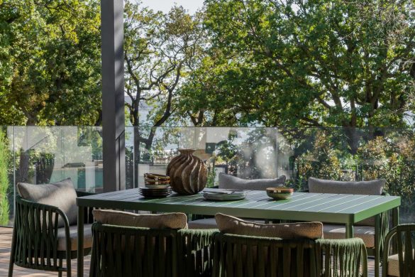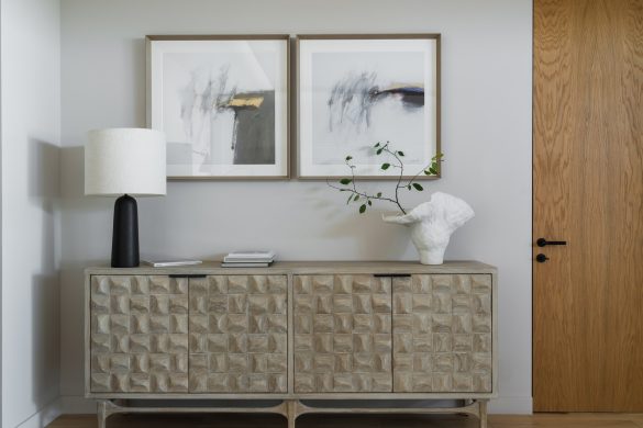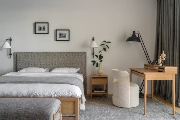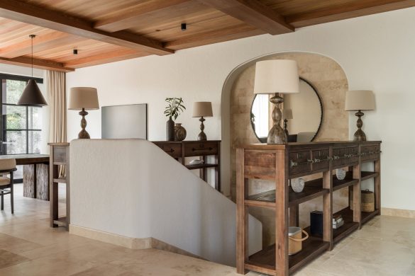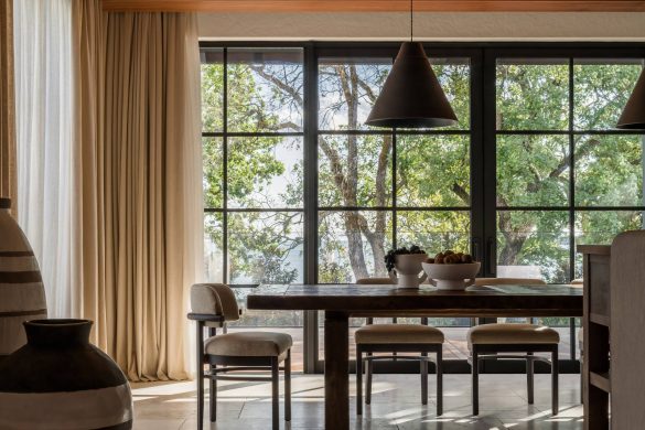 Το καθιστικό αποτελεί το κέντρο μιας διάταξης “enfilade”, όπου τοξωτά ανοίγματα δημιουργούν βάθος και ροή. Κεντρικό στοιχείο είναι ο αρθρωτός καναπές Narvik, ενώ η αρχιτεκτονική καμάρα επαναλαμβάνεται σε μια απαλά καμπυλωτή κόγχη-βιβλιοθήκη.