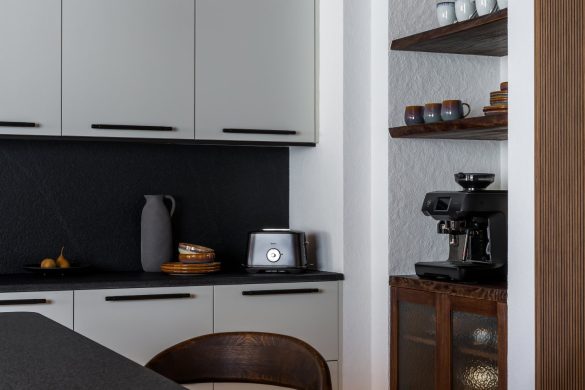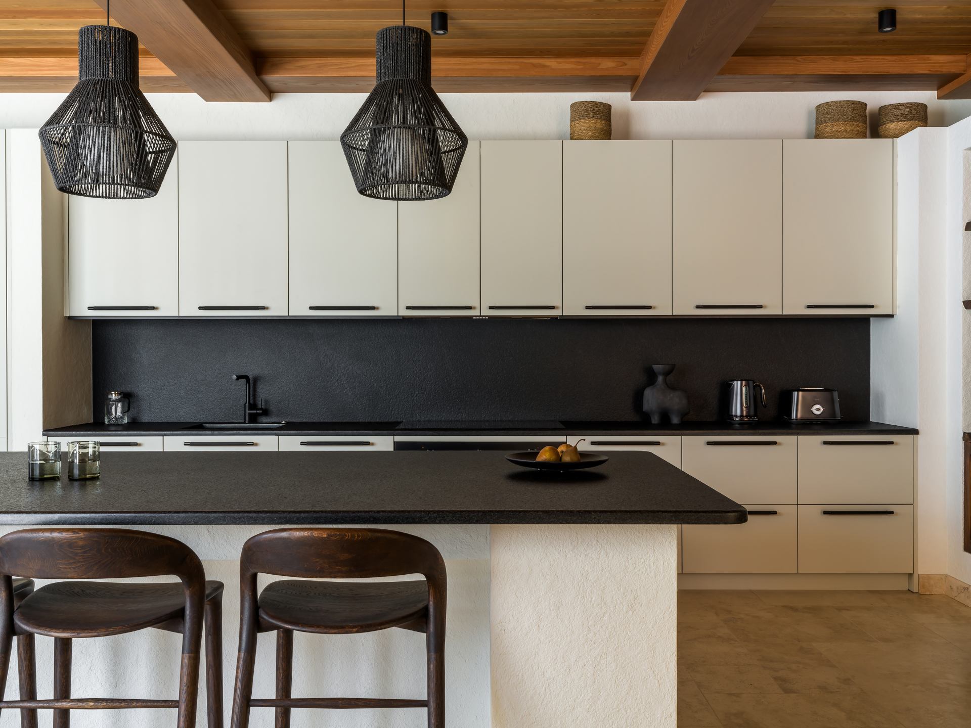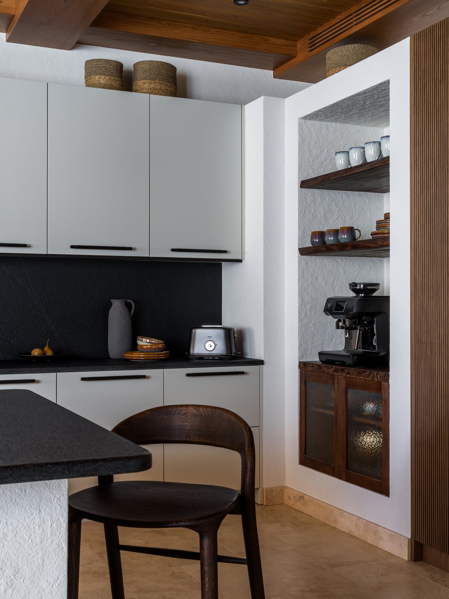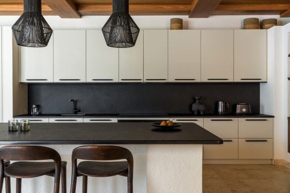 Η κουζίνα, σχεδιασμένη για τον ιδιοκτήτη που έχει εκπαιδευτεί ως σεφ, διαθέτει έπιπλα Dantone Kitchen, έναν μεγάλο νησίδα από γρανίτη και προσόψεις από ραβδωτό χαλκό.