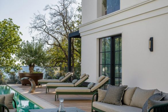 Κάθε υπνοδωμάτιο έχει τον δικό του χαρακτήρα, από αμερικανικά κλασικά στοιχεία μέχρι αποικιακό design. Εξωτερικά, το σπίτι διαθέτει ένα σύστημα πολλαπλών επιπέδων από ταράτσες. Η πισίνα infinity, περιτριγυρισμένη από ξύλινο δάπεδο (deck), με τα τιρκουάζ νερά της θυμίζει λιμνοθάλασσα των Μαλδίβων.